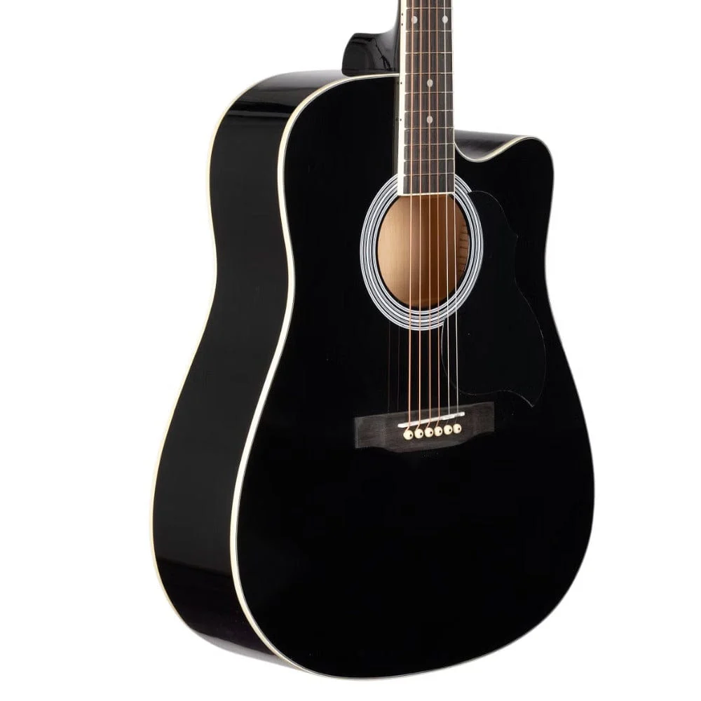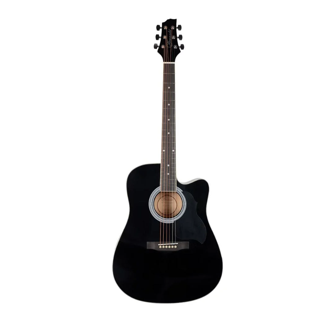 Features: Full-size 41″ Dreadnought guitar with a Cutaway Massive and punchy tonal projection Chrome diecast tuners All Linden Laminate construction Specifications: Body Shape: Dreadnought Cutaway Cutaway: Yes Top Material: Linden Laminated Back Wood: Linden Laminated Sides: Linden Laminated Length: 41″ Scale length: 650 mm Binding: ABS Rosette: Decal Logo: Laser Bridge: Composite Rosewood Tuners: Die Cast Chrome Fingerboard: Composite Rosewood Nut: ABS String: Local EQ: No Finish: Gloss Color: Black