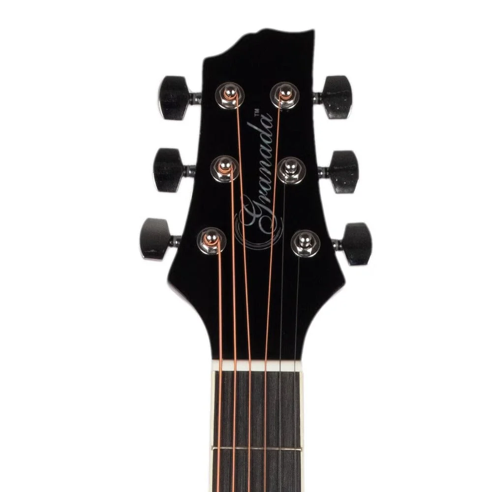 Granada GL113D-C 6 String Cutaway Acoustic Guitar Overview: GL113D-C is the perfect beginner’s guitar. It is a full-size 41″ Dreadnought guitar with a Cutaway featuring an all Linden Laminate construction which offers a massive and punchy tonal projection. It has a Composite Rosewood fretboard, bridge, and chrome diecast tuners for better tuning stability. Available in Natural, Black, and Vintage Sunburst colors with a Gloss finish.