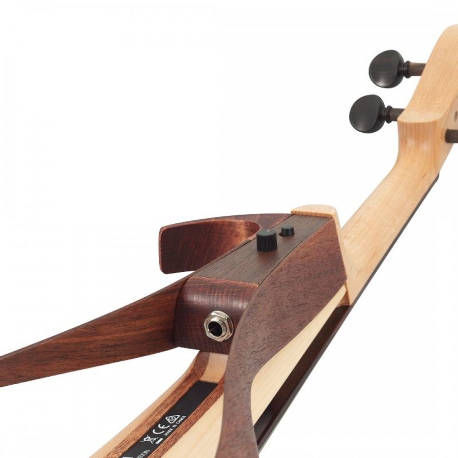 The violin features an airy infinity loop-like design inspired by acoustic guitar craftsmanship, which not only contributes to its striking visual appeal but also enhances acoustic space representation. Its streamlined shape includes a standard ¼-inch input jack, ensuring compatibility with a wide range of amplifiers and effects units without additional adapters.