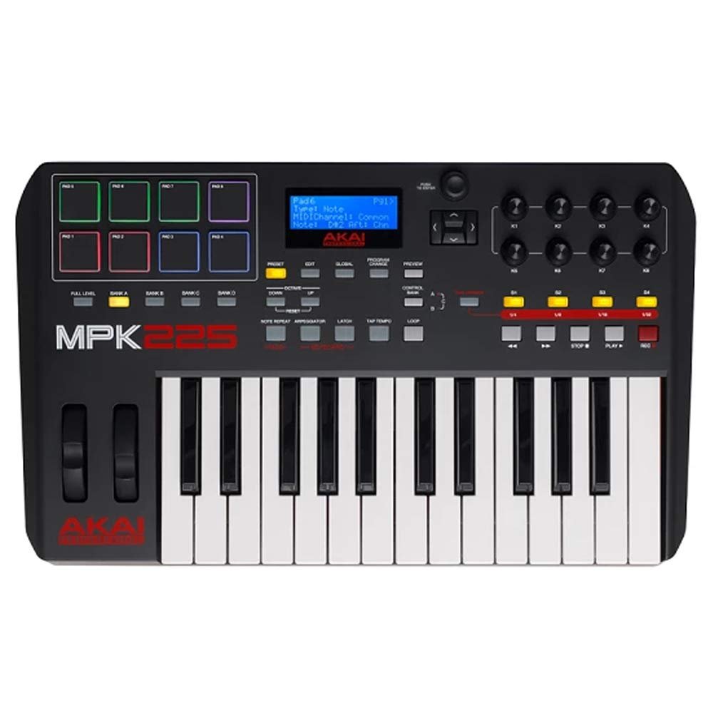 Each member of Akai Pro’s MPK series comes fully loaded with a comprehensive interface for manipulating virtual instruments, effect plugins, DAWs, and more. MPK225 features 25 semi-weighted keys with aftertouch, 8 MPC-style pads with RGB feedback, 8 assignable knobs, 4 backlit buttons, and onboard transport buttons. Three banks expand the number of knobs and switches (up to 24 and 12, respectively), and four pad banks expand the number of pads (up to 32 total). Plus, MPK225 is USB-powered and optimized to interface directly with your Mac or PC with plug-and-play.