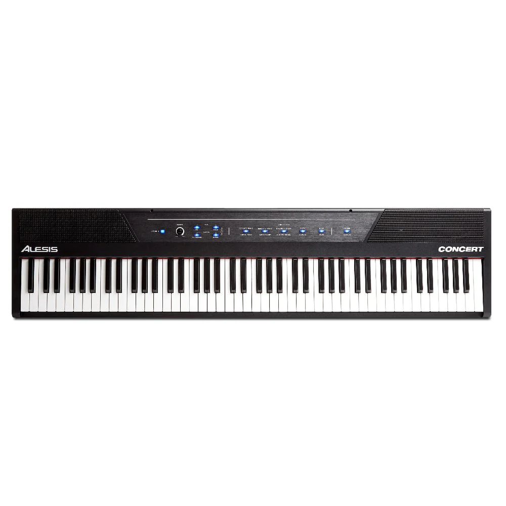 The Concert 88-Key Digital Piano with Full-Sized Keys from Alesis is a full-featured digital piano with 128-note polyphony, semi-weighted keys, adjustable touch response, and a built-in 20W speaker system. It features 10 built-in voices: acoustic piano, bright piano, electric piano, harpsichord, drawbar organ, church organ, synth, strings, bass, and clavi. The keyboard can be used to customize the voices by combining any two sounds in layer mode or by assigning to the left or right hands in split mode. In addition, it features adjustable reverb and chorus to further tailor your sound and delivers a great playing experience for the beginner student and the intermediate or professional musician.