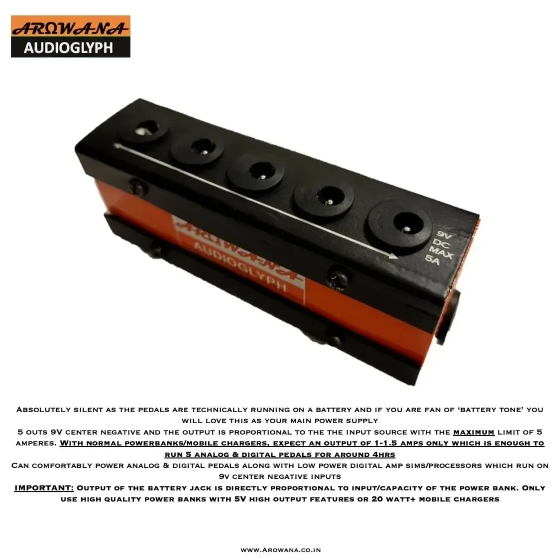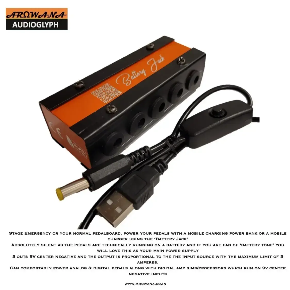 Stage Emergency or your normal pedalboard, power your pedals with a mobile charging power bank or a mobile charger using the ‘Battery Jack’ Absolutely silent as the pedals are technically running on a battery and if you are fan of ‘battery tone’ you will love this as your main power supply 5 outs 9V center negative and the output is proportional to the the input source with the maximum limit of 5 amperes.