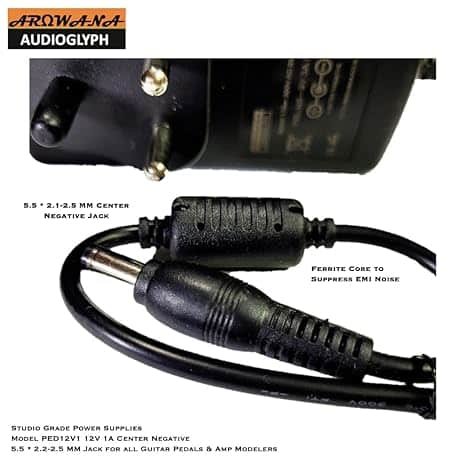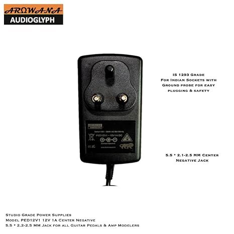 Studio Grade Power Supply with zero noise operation with short circuit & overload protection 12 Volt 1 Amp Center Negative with 5.5 2.1-2.5 mm jack for guitar pedals, Line6 HX Stomp and other processors, Nano Cortex, Neural DSP 1 Mtr Cable Length Ferrite Core to eliminate EMI & RFI Built Solid to withstand the road & studio