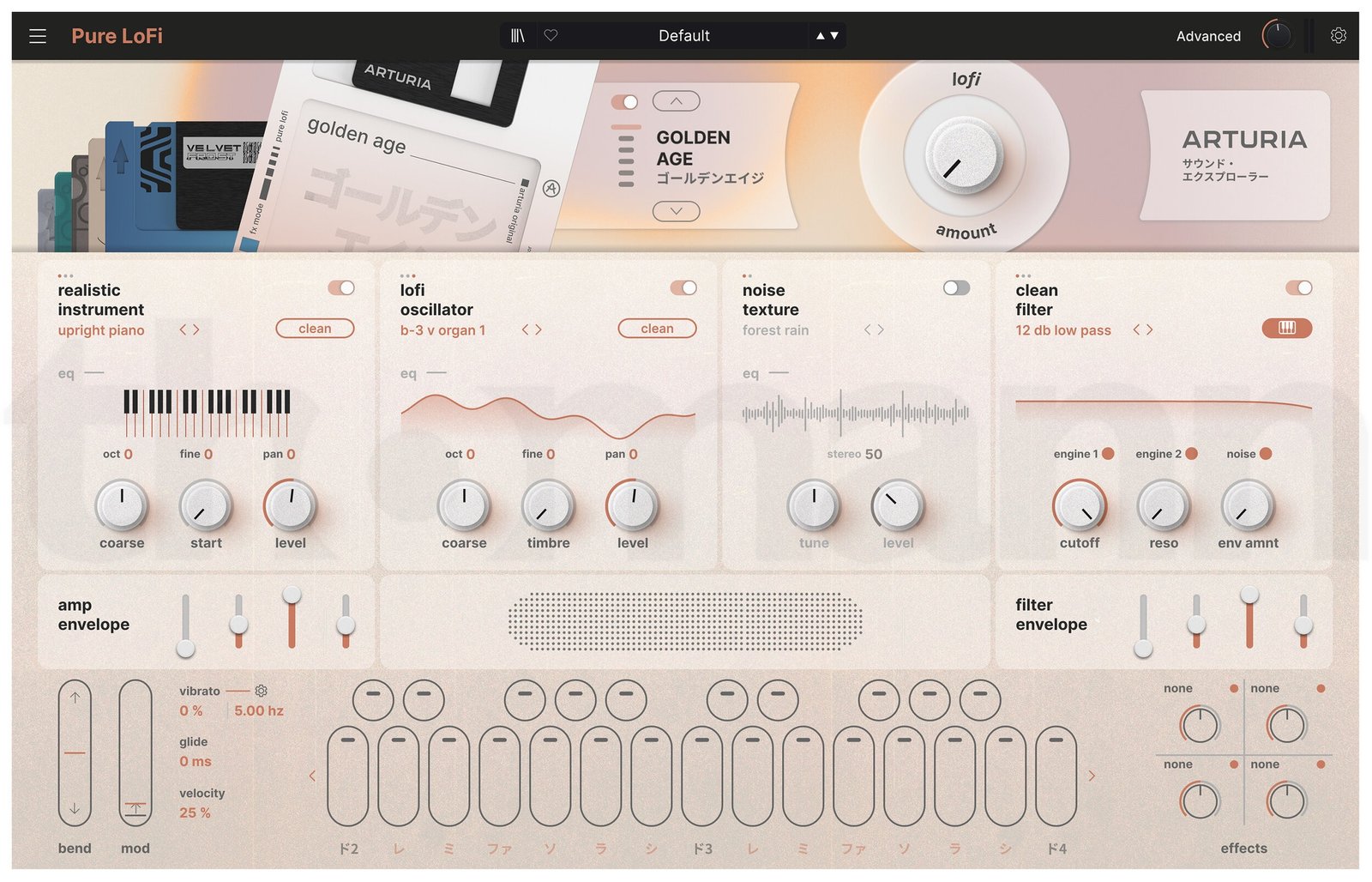 The multimodality of the Arturia Pure LoFi instrument is an all-encompassing array of timbral contouring that conjures the indelibly imperfect textures of analog and digital gear of the past 50 years, blending versatile processing with sampling and synthesis across three dedicated LoFi Engines. Low-fidelity tinctures of texture grant access to the tape machine and analog synthesis stylings of the ‘70s and ‘80s; the tape saturation, drum machines, and groovebox-sampling profiles that emerged and evolved in the late 1980s; and the nostalgia-fueled assemblage of vinyl-sampled tracks, VHS-like character, and liminal-space sonics that artists such as Nujabes, Lofi Girl, and Øneheart have brought to the world since the 2010s. With 250 presets, multitudes of processing capabilities, ferociously flexible filters, and spellbinding multi-sampling capabilities, Pure LoFi delivers powerful out-of-time texturization and a robust polychromic sampler-synthesizer that’s endlessly adaptable yet unwaveringly devoted to its namesake aural aesthetics.