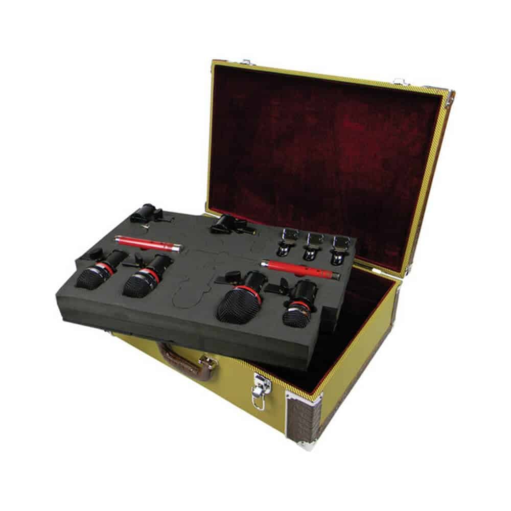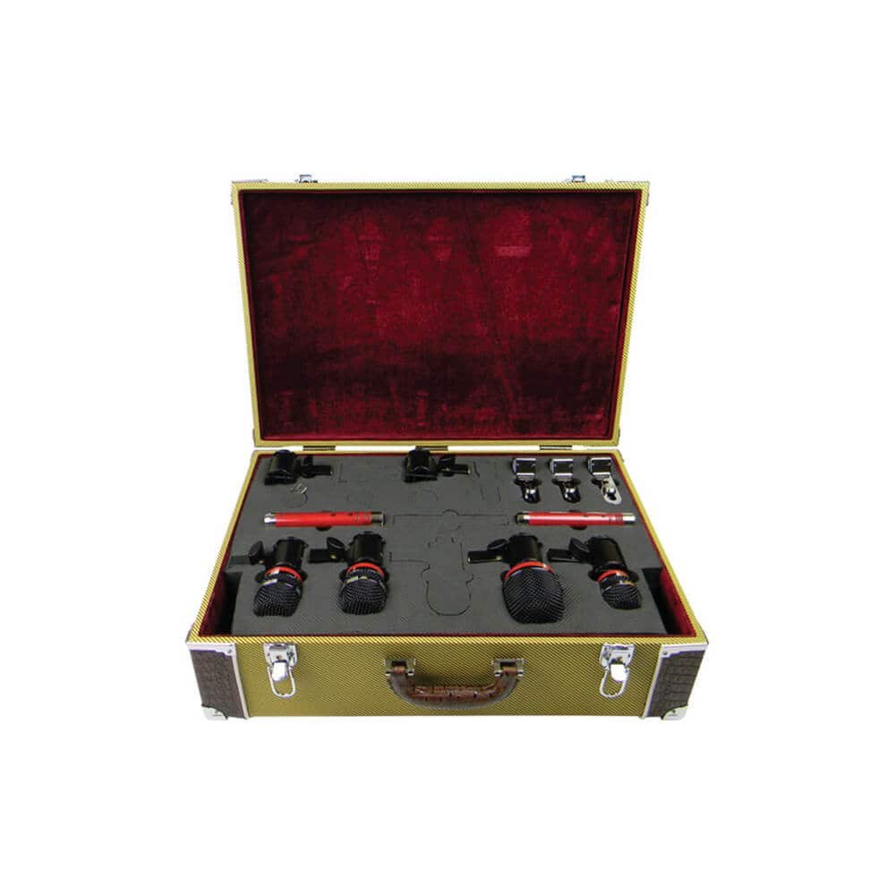 The handcrafted antique tweed box is designed for heavy-duty storage (and it looks amazing!). This case’s metal borders, lockable latches, high-density foam tray, and plush interior make it extremely sturdy while maintaining a visually pleasing look. Outside, the case has tweed and faux alligator accents, while the interior is Cabernet wine-red plush. The slotted foam tray not only protects and preserves each component of the drum mic set, but it also lifts out of the container to provide room for cables, sticks, and accessories. Furthermore, removing the tray yields an excellent and very appealing piece of carry-on luggage.