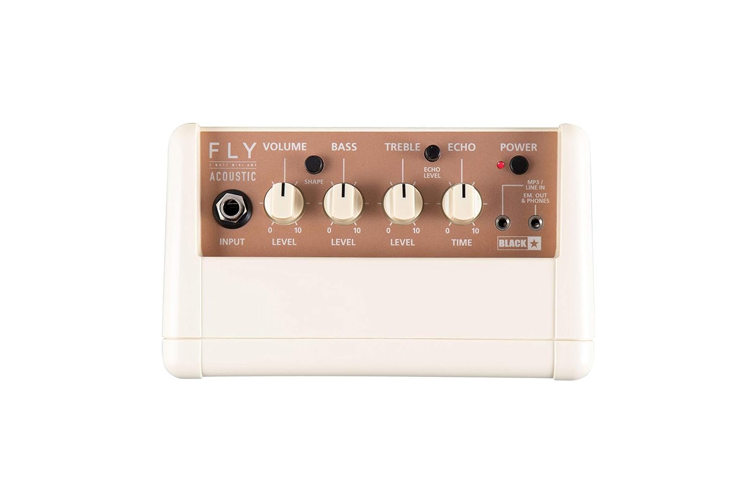 6-watt stereo acoustic setup Two-band equalizer and a shape select switch Digital tape delay effect with level control MP3/Line In for jamming along or listening to music Emulated Line Out for silent practice or recording Revolutionary sonic performance Powered via batteries or DC outlet Includes FLY 103 acoustic extension cabinet