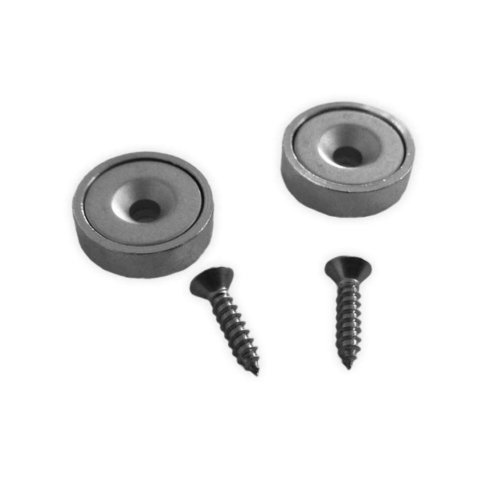 The EASY LOCKS are a magnet set (incl. screws) for mounting the BluGuitar® AMP1™ on a pedal board. The set consists of two neodymium magnets, which are screwed onto your pedal board (or anywhere you want to mount your AMP1™ to), each of them holding up to 5 kg. On the bottom side of the AMP1™ there are two matching magnetic metal counterparts to fix the AMP1™ to the magnets. In contrast to using Velcro, you can take the AMP1™ off your pedal board cleanly, easily and quickly at any time to transport it in a gig bag, for example, if you don’t want to travel light.