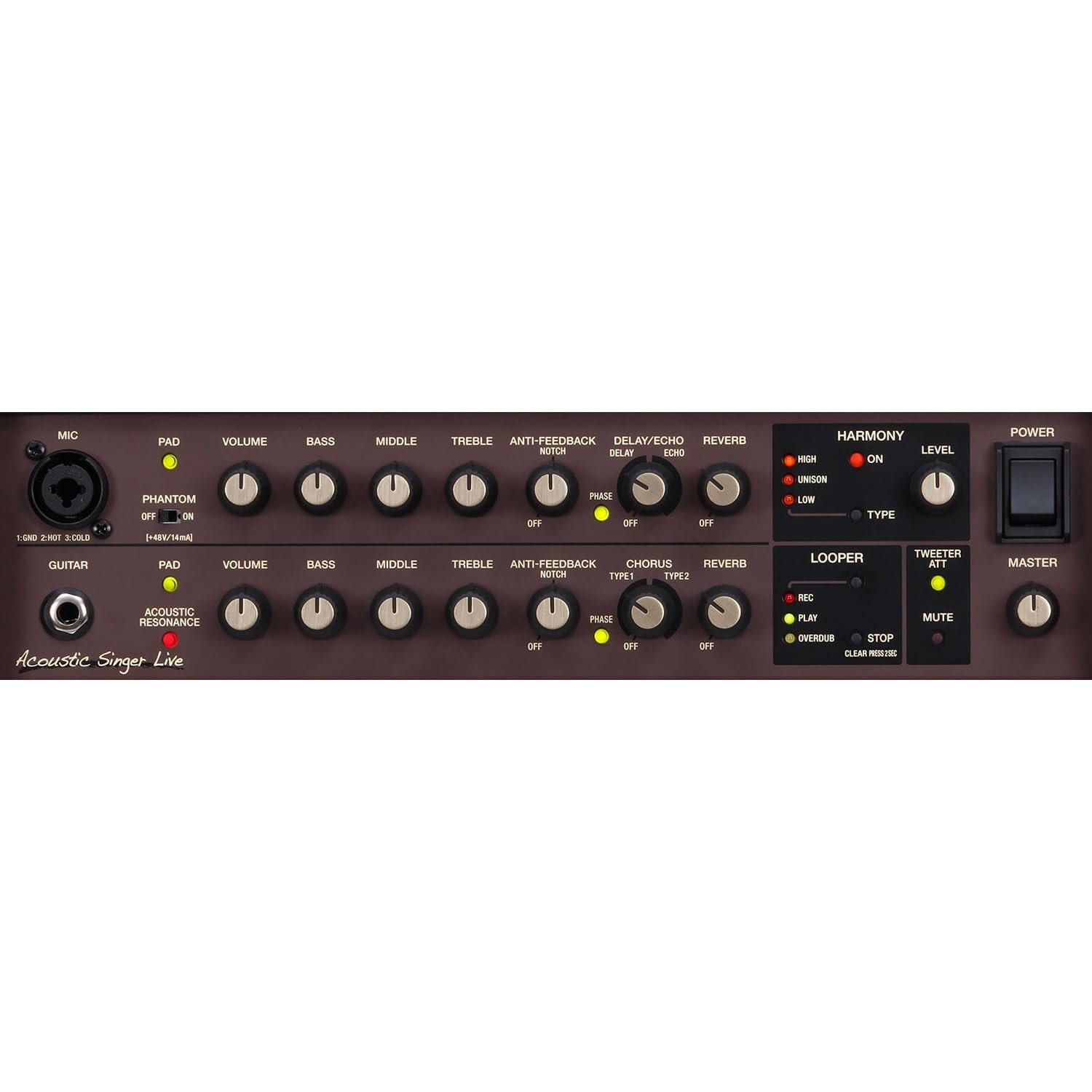 Professional acoustic amplifier with premium sound and features 60–watt bi-amp design with custom-designed 6.5-inch woofer and dome tweeter Dual channels with discrete analog input electronics and three-band EQ Dedicated guitar channel with Acoustic Resonance to restore natural tone to stage guitars with piezo pickups Mic channel with phantom power and ¼-inch/XLR combo input for connecting a vocal