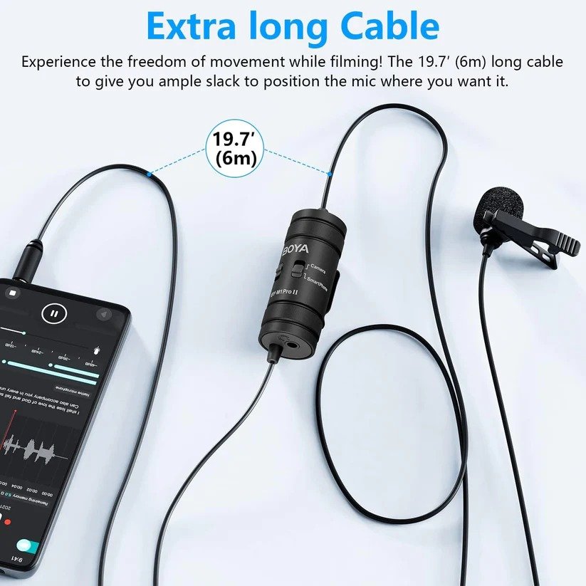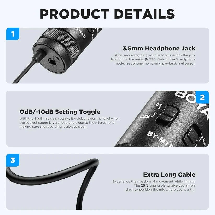 - Upgraded BY-M1 Pro : BY-M1 Pro II is an upgraded version of the previous generation. Highlights: 1. No battery – plug and play, direct recording without additional power supply. 2.The Frequency Response is increased to 50 Hz~20KHz, which can capture more sound details and restore the original high-definition audio