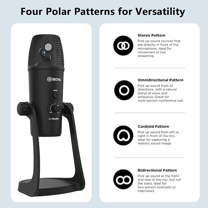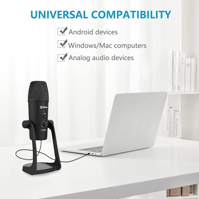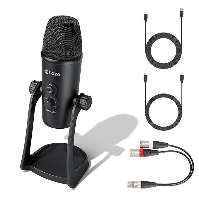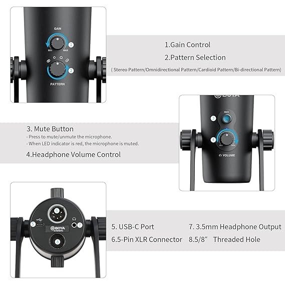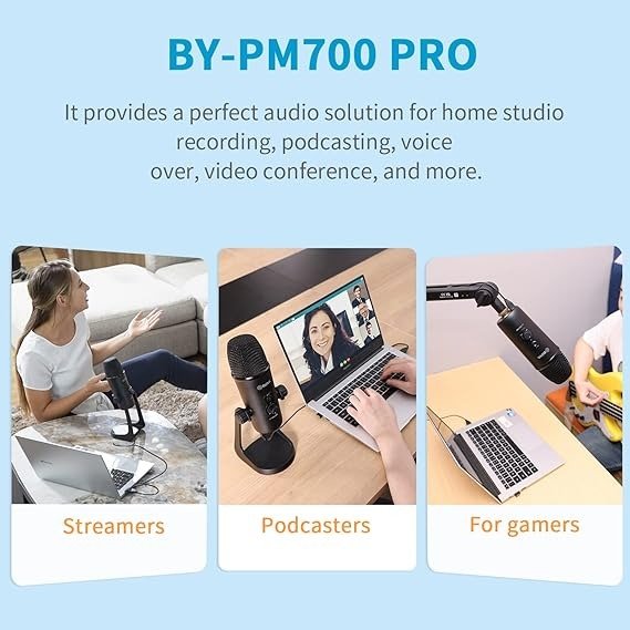 The BOYA BY-PM700 Pro is a desktop microphone with USB digital output and XLR analog output, compatible with Android devices, Windows/Mac computers, and analog audio devices. It provides a perfect audio solution for home studio recording, podcasting, voice over, video conference, and more. XLR & USB Two Output Selections The BY-PM700 Pro offers both XLR and USB-C interfaces, allowing it to be connected with all USB-C devices and analog audio devices. The USB output jack is powered by DC 5V while the XLR output jack is powered by phantom power 12-48V.