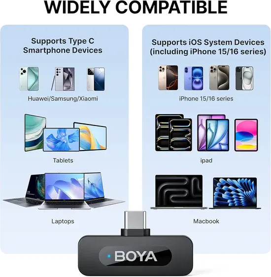 The BY-V series is a professional-grade wireless microphone system ideal for on-the-go recording, whether you’re traveling, recording podcasts, or doing live streams. The BY-V10 is suitable for most Android devices with USB-C ports also comes with 1 transmitter & 1 receiver. It offers a high-quality audio solution at an affordable price, making it accessible to a wider range of users.