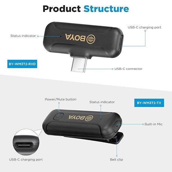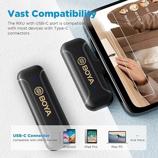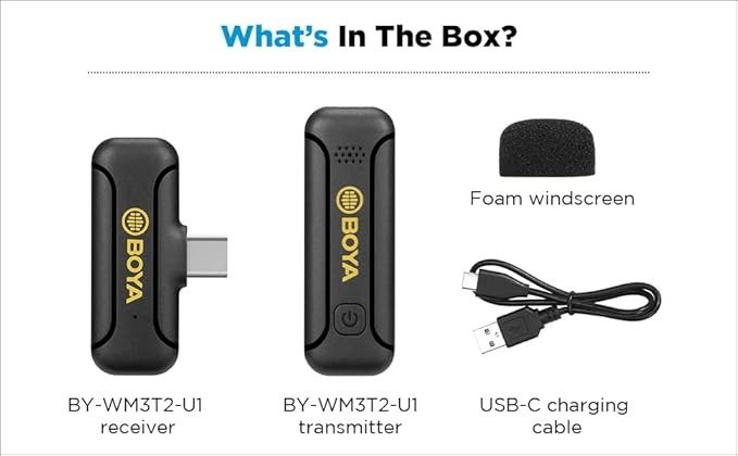 - BOYA NEW WIRELESS LAVALIER MICROPHONE : BY-WM3T2 series is a mini 2.4GHz wireless microphone system that provides high-quality sound for live streaming, vlogging, course recording, and other audio capturing app lications.The BY-WM3T2-U2 is compatible with most devices with a USB-C port including Android smartphones and tablets. Including the 2 transmitters, BY-WM3T2-U2 can record two sound sources at the same time.