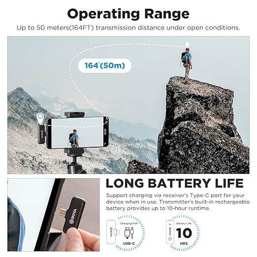 - SUPPORT LIVE BROADCASTING AND PHONE CHARGING SIMULTANEOUSLY : Â When the BY-WM3T2 receiver is plugged into a smartphone, the phone can be charged via Type-C charging port on the receiver. It ensures your uninterrupted work for a long time, such as live streaming. Besides, the built-in rechargeable battery of the transmitter provides up to 10 hours of run time, which helps you get a full day of audio recording.