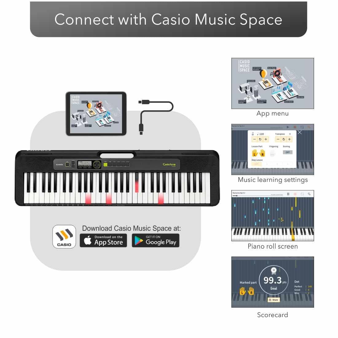 Display 50 in-app demo songs or downloaded MIDI files on the CASIO MUSIC SPACE piano roll or musical score screen to play your favorite songs anytime, anywhere. Play music without reading a musical score by striking keys in rhythm with the bars as they scroll down from the top of the screen. Track your score on the app’s scoring feature to make practice fun and watch your playing improve.
