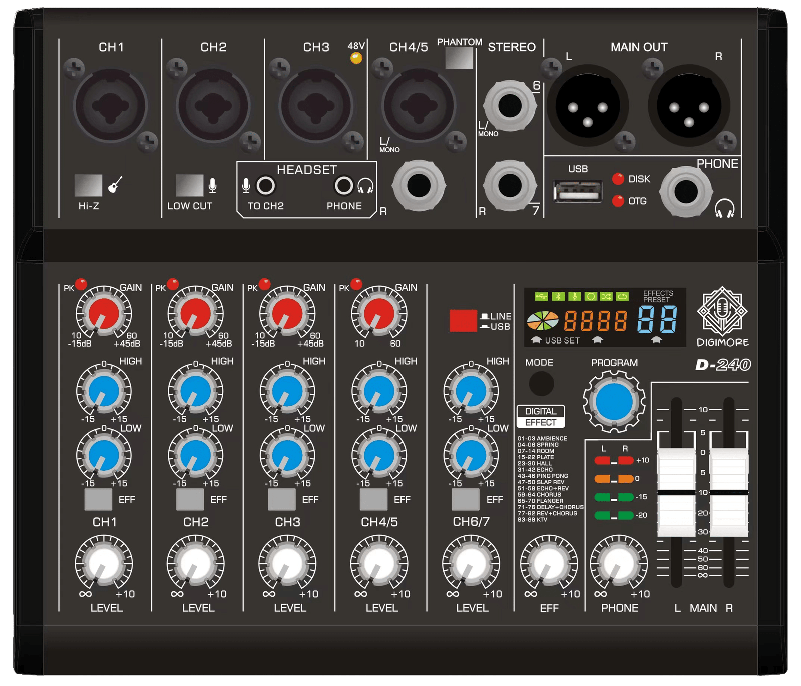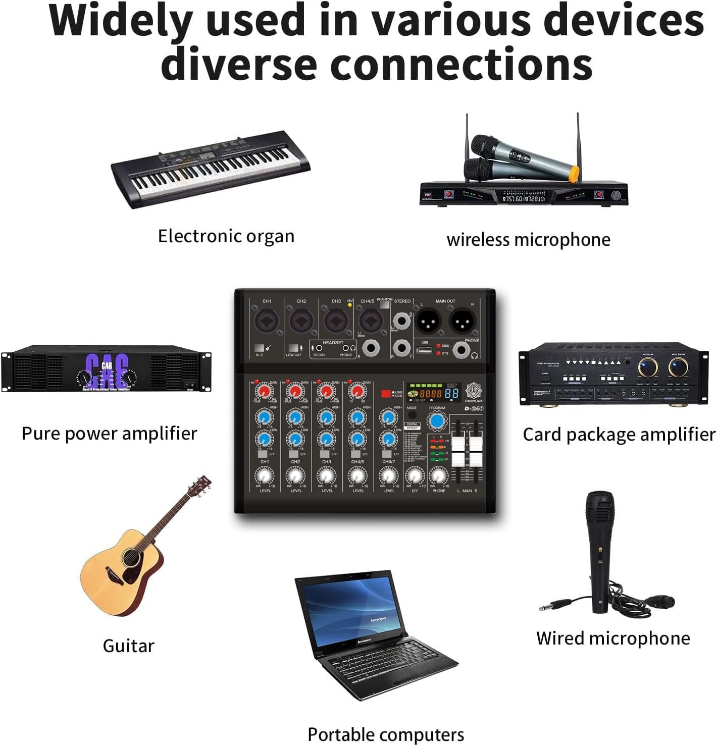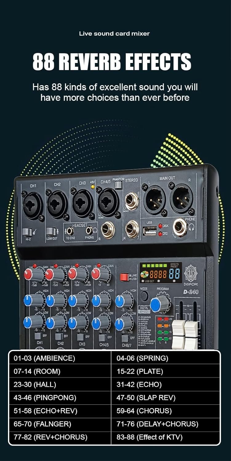 The DIGIMORE 7-Channel Audio Mixer offers exceptional compatibility with multiple devices. It features four microphone inputs (two left and right) using 6.3mm and XLR connectors, ensuring reliable and stable transmission. Whether you’re connecting professional mics, instruments, or audio gear, this mixer delivers top-notch performance for all your audio needs. Its versatile input options make it suitable for home studios, live performances, and professional recordings.