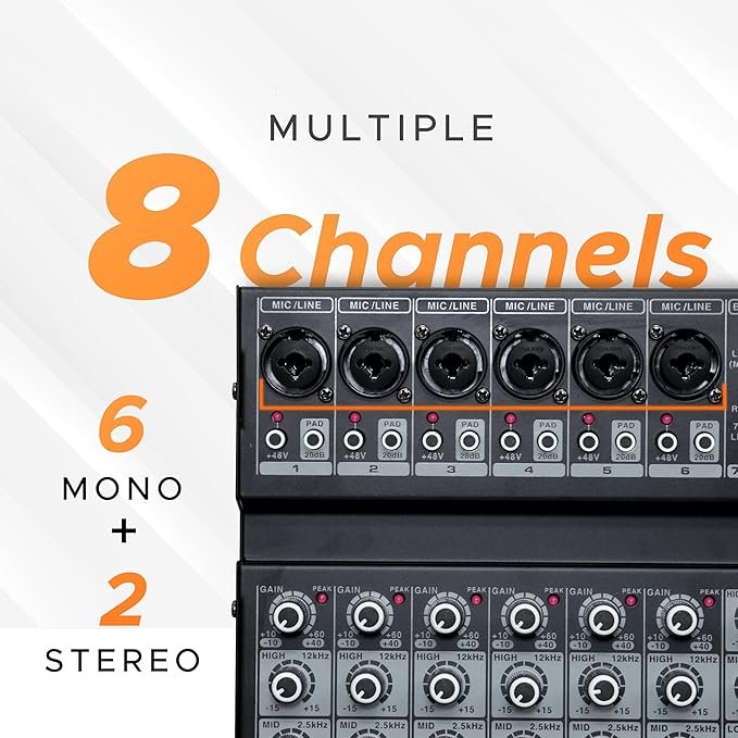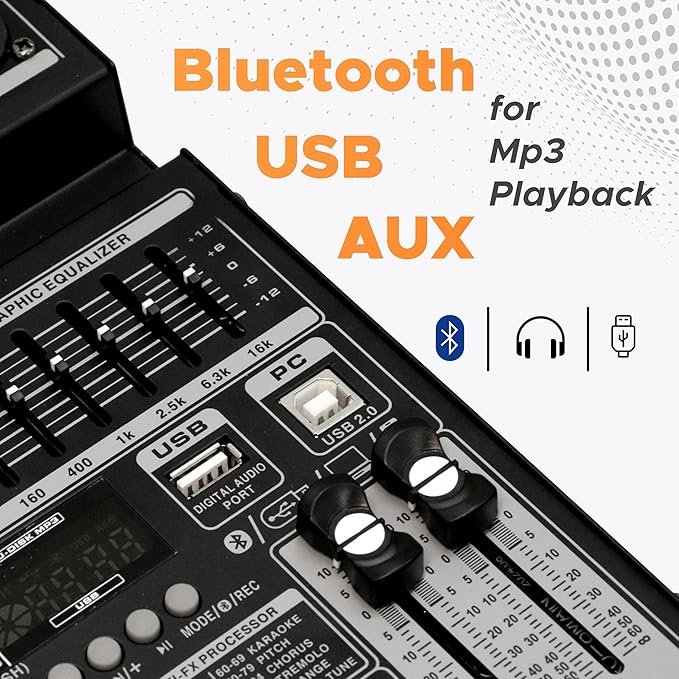 The Digimore 6-Channel Professional Audio Mixer Board offers seamless Bluetooth connectivity for wireless streaming from IOS, Android, tablets, and MP3 players. Mix multiple audio signals effortlessly and enjoy 32-level DSP echo effects, a 7-band equalizer, and USB flash drive playback. Perfect for live events, studios, or podcasts, this compact mixer ensures crystal-clear sound quality and versatile performance with every session.