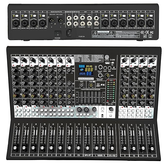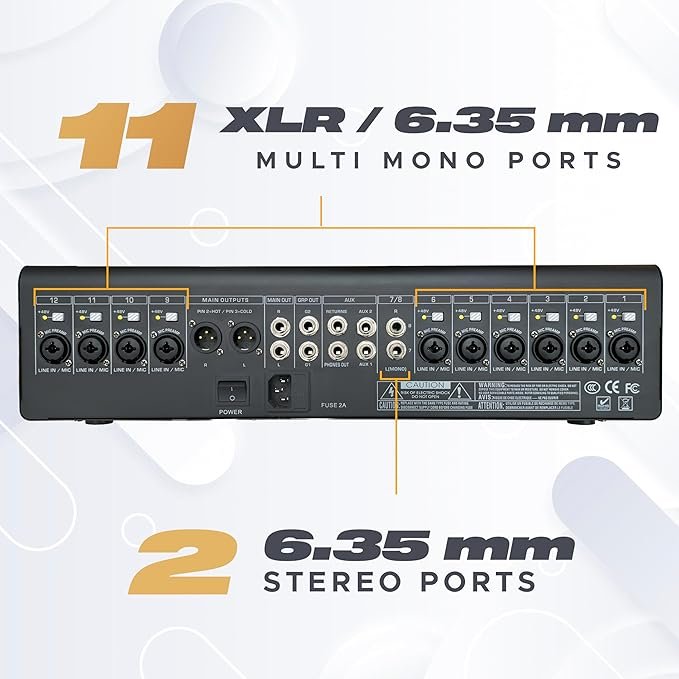 - Pro-Grade 12-Channel Mixer – Ideal for studio, live sound, and stage setups with individual 48V Phantom Power and Mute Switch per channel for full control and flexibility.