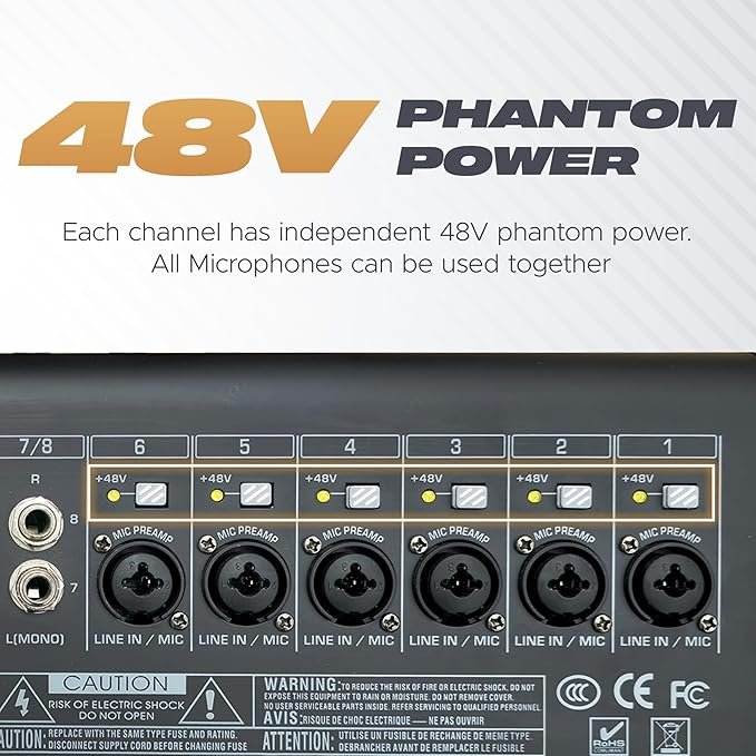 - “Individual Channel 48V Phantom Power for Condenser Mics: Supports 48V phantom power on mono channels, allowing you to connect condenser microphones for studio-quality vocal capture.”