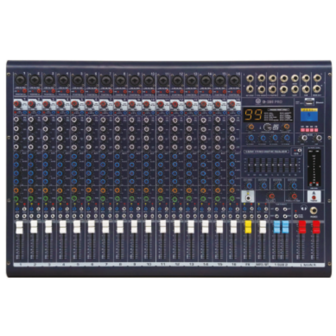 The Digimore D-295 Pro Professional Mixer is designed for sound engineers, musicians, and event professionals who demand superior sound quality and versatility. With 16 input channels, a frequency response of 10Hz–22KHz, and an ultra-low THD of 0.01%, it guarantees crystal-clear, distortion-free audio. The mixer’s 99 DSP digital effects and 9-band stereo graphic equalizer allow fine-tuning for any environment, while Bluetooth, MP3/USB/SD playback, and dual sub outputs enhance flexibility for modern setups. Its signal-to-noise ratio of ≥ -98dB and input sensitivity of -129.5dBu ensure noise-free operation, and with 4 AUX sends plus a 32-bit/40KHz sampling rate, the D-295 Pro delivers rich, detailed sound—making it an ideal choice for professional mixing and live sound applications.