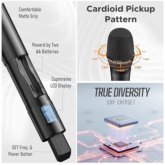 Experience flawless sound with Advanced True Diversity UHF Transmission, ensuring interference-free and stable performance. With crystal-clear audio, this system minimizes signal dropouts, making it reliable for professional use. Whether on stage or during a presentation, performers can deliver confidently without interruptions. Enhanced DSP frequency lock technology guarantees low distortion and high sensitivity, preserving natural sound quality. Ideal for musicians, DJs, and speakers who demand precision, this microphone system delivers studio-level clarity for every performance, making your voice stand out in any environment.