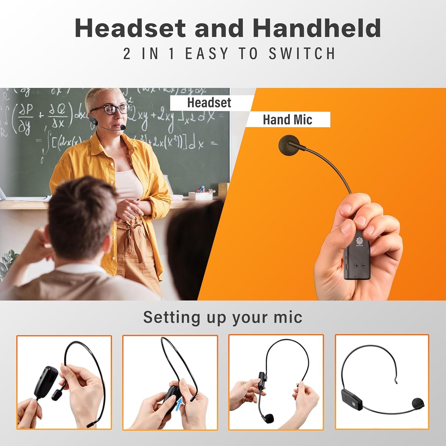 • 2-in-1 Headset Microphone: Functions as both a wireless headset and handheld microphone for various applications.