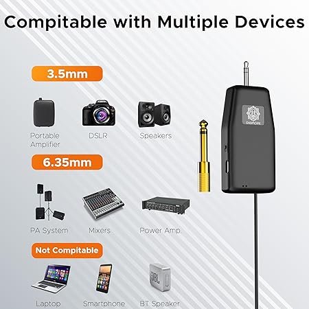 • Wide Compatibility: Works with a range of devices including voice amplifiers, PA systems, and mixers. Comes with a 3.5mm to 6.35mm adapter.