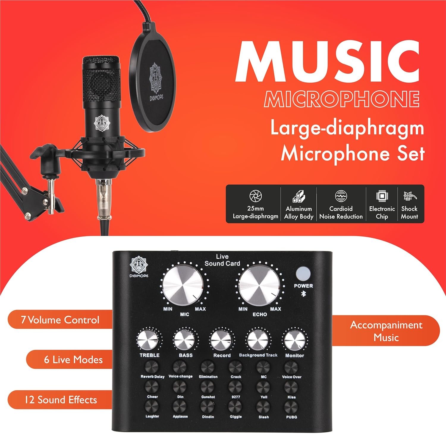 Experience crystal-clear vocals and professional sound quality with the Digimore D-430 Condenser Mic Kit, designed to capture every nuance with its unidirectional polar pattern and impressive 110 dB signal-to-noise ratio. Equipped with a live sound card featuring a voice changer and effects, this kit seamlessly connects via Bluetooth or USB to your laptop, smartphone, or karaoke machine. Elevate your recordings and performances effortlessly—discover how this versatile microphone can transform your audio experience.