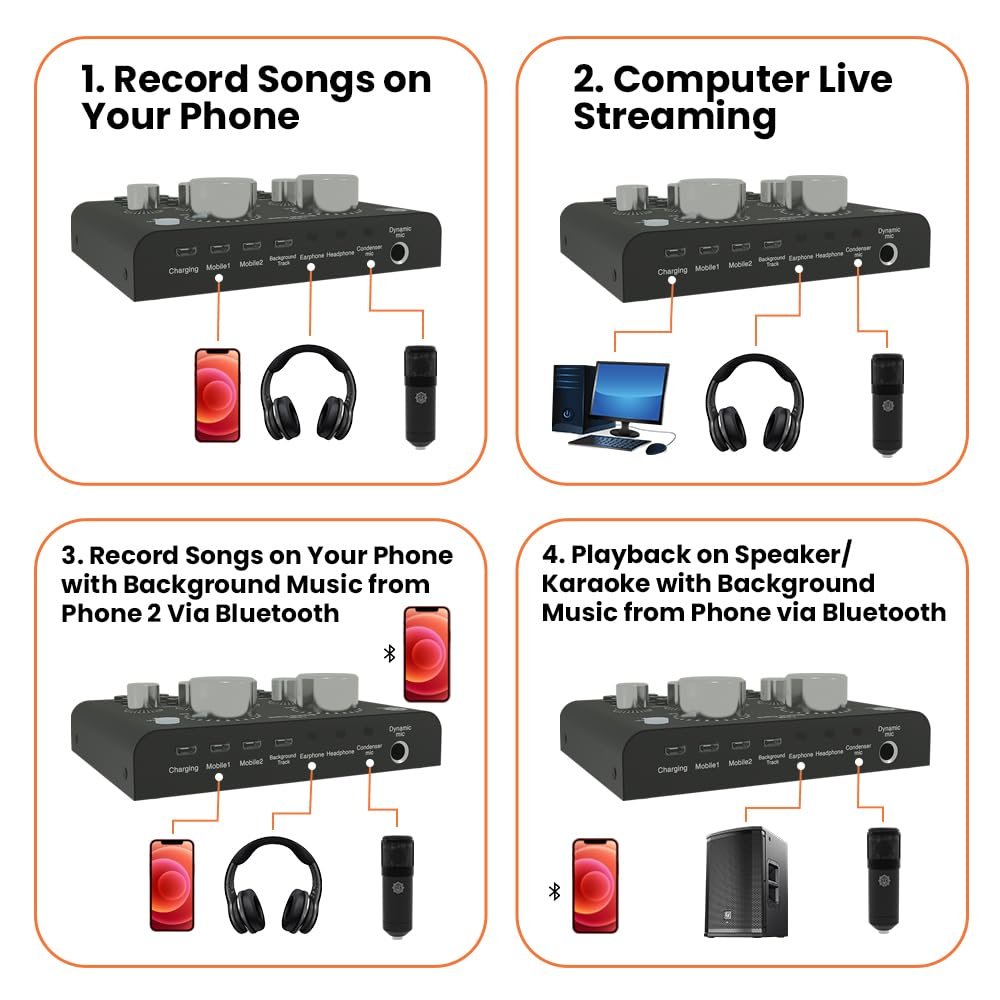 • Rich Sound Effects & 4 Voice Changer: The audio interface mixer has 4 sound variations(Female,Male,Child and Monster)and can produce 12 sound effects. Which is designed for recording,podcasting&live streaming