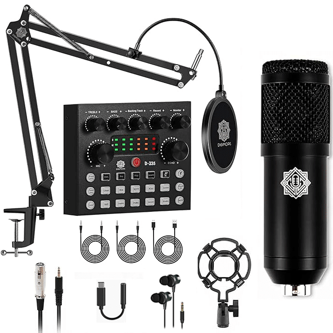 • Great Podcast Equipment Bundle: The Podcast Equipment Bundle is equipped with black D-430 microphone, Mic adjustable suspension scissor arm stand, Shock Mount, Pop Filter, and D-235 live sound card. This recording studio package was designed for singing, podcasting, streaming and recording music and short video. What you get is a complete set of podcast microphone bundle.