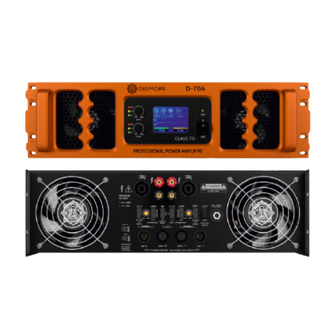 Digimore D-70A Professional Amplifier delivers unmatched performance with powerful 2-channel output, precision Class TD circuitry, and advanced protection. With up to 9500W bridge power and superior damping (>2000), it ensures clean, distortion-free sound for professional audio setups.