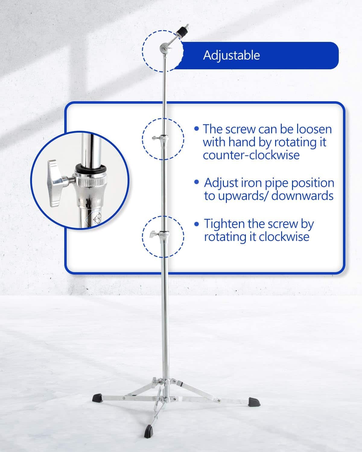 The stand’s straightforward straight design provides direct vertical support, minimizing unwanted movement and vibrations during intense playing. Its height and footprint are optimized for typical cymbal sizes, ensuring compatibility with a wide range of cymbal diameters common in drum kits.