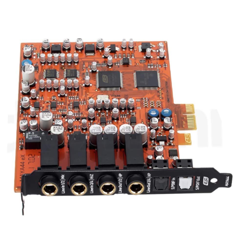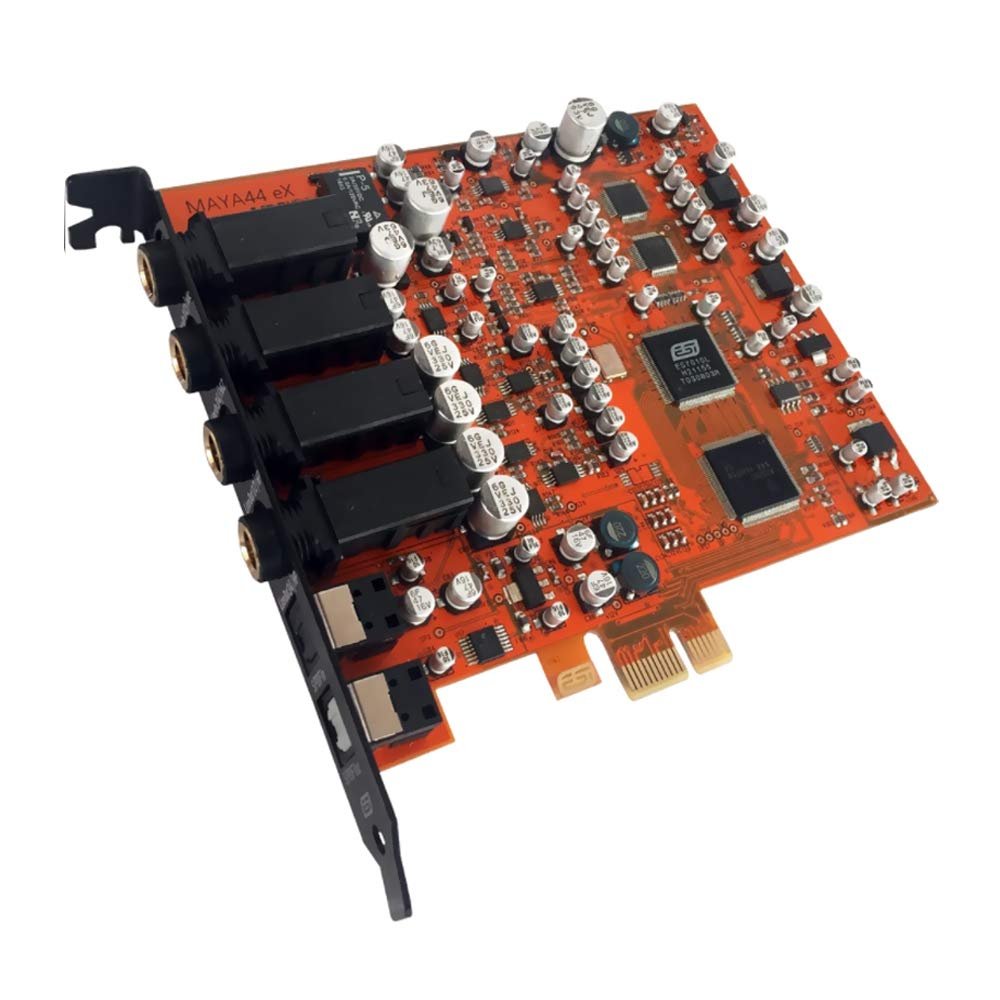 The MAYA44 eX is a high quality ultra high performance 24-bit / 96 kHz 4-in / 4-out PCIe audio interface, providing a number of powerful and amazing features optimized for home recording on a professional quality level and for various professional applications. The latest version of our popular family of MAYA44 interfaces can easily be used by home users making their first steps in computer audio as well as by professionals who produce music on a budget, looking for a professional, yet affordable, PCIe audio solution based on the latest ESI hardware technology that is compatible with virtually any computer providing a PCIe slot. MAYA44 eX provides 2 stereo analog line inputs, 2 stereo line outputs, a microphone input with +48V phantom power and preamp, a Hi-Z guitar instrument input, a headphone output, as well as an optical S/PDIF output and an optical S/PDIF input. On the software side, an extended version of our EWDM driver with full DirectWIRE support is provided. All this makes MAYA44 eX a perfect solution for a magnitude of audio applications such as home recording, podcasting, audio streaming, multichannel playback, professional DJ and much more.