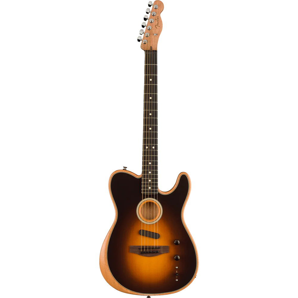 A stylish Shadow Burst hybrid guitar that combines acoustic warmth with electric versatility, featuring Fender and Fishman-designed electronics, multiple tonal voices, and a lightweight hollow body for modern performance.