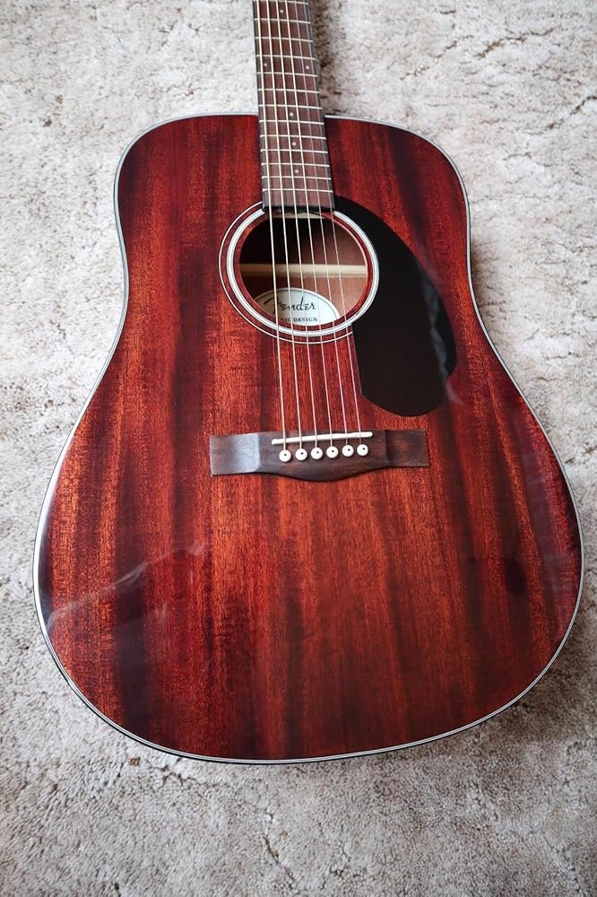 I bought this guitar to add a mahogany guitar to my small collection of acoustic guitars. Mahogany has a different tone than spruce or cedar that I wanted to experience.First the pros of the guitar:1. The mahogany top has a stunning grain and color way better than the picture.2. The tuners are really smooth and are the best I have used.3. The action is the lowest from any guitar that I have bought and is very easy to play.3. The sound, maybe I should have started with the sound … really great! I love the sound deep and crystal clear and I should say loud. I am very impressed!!!Some flaws I found when checking the guitar:1. On the inside of the guitar on the back wall I noticed a couple of glue drips that are not visible unless you look in the sound hole and back.2. When the bridge was installed not all excess glue was wiped off and some tiny dried glue beads are visible on one side of the bottom of the bridge.3. A tiny piece of white masking tape was at the neck of the guitar right at the sound whole that was varnished right over. I managed to scrape it off with a knife.The finishing flaws were minor so that I still give a 5 star rating. Overall I am more than impressed and I would buy this guitar again. The sound of the mahogany is special and I am very happy to be able to play and listen to this sound. Fender make great guitars! Thank you!