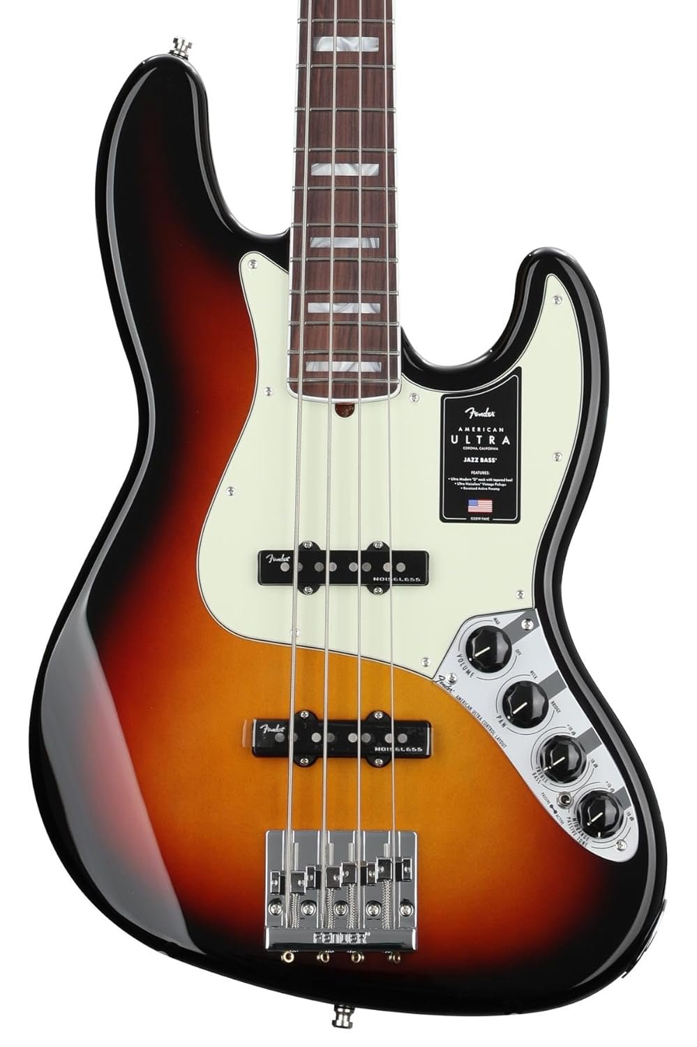 The Ultimate Production J-Bass The American Ultra neckplate graces Fender’s top-of-the-line production instruments — their most advanced series of guitars and basses for discerning players who demand the ultimate in precision, performance, and tone. The Fender American Ultra Jazz Bass delivers the same iconic vintage vibe and visuals as its ancestors. But play a few notes and you’ll quickly realize that this is a state-of-the-art, high-performance axe. The contoured offset alder body balances beautifully and always feels just right; while the fast, slim Modern D neck profile, compound-radius fingerboard, and tapered neck heel turbocharge your playing. Amazing-sounding Fender Ultra Noiseless Vintage Jazz Bass pickups and active 3-band electronics complete the setup.State-of-the-art performance, vintage-inspired tone Plug into your amp or interface and you’ll savor legendary, punchy Jazz Bass tone with zero hum, thanks to a dynamic duo of Ultra Noiseless Vintage Jazz Bass single-coil pickups. This arrangement gives you the low-end