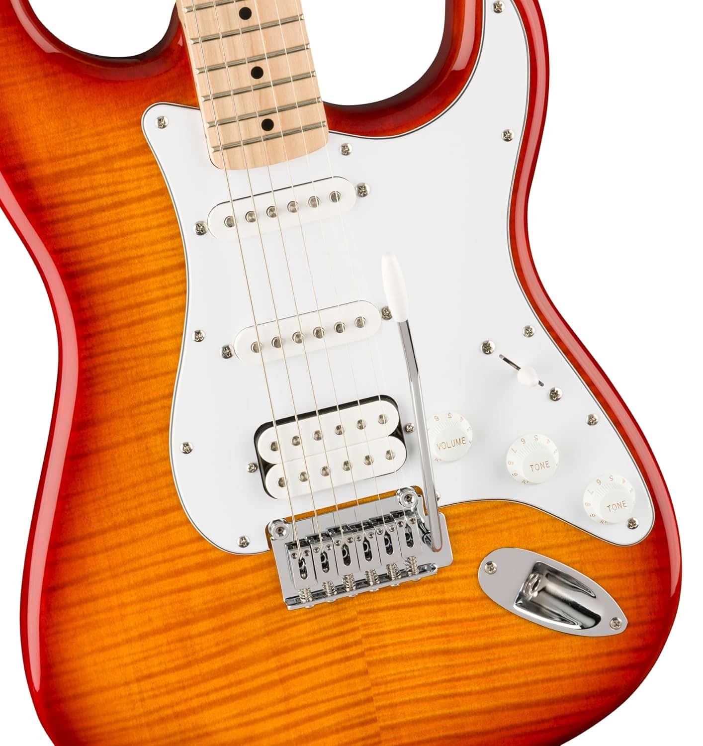 A superb gateway into the time-honored Fender® family, the Squier® Affinity Series® Stratocaster® FMT HSS delivers legendary design and quintessential tone for today’s aspiring guitar hero. This Strat® features several player-friendly refinements such as a thin and lightweight body with an eye-catching flame maple top (FMT), a slim and comfortable “C”-shaped neck profile, a 2-point tremolo bridge for superior tremolo action and sealed die-cast tuning machines with split shafts for smooth, accurate tuning and easy restringing. Loaded with a Squier humbucking bridge pickup and single-coil neck and middle pickups for genre-defying sonic variety, this model is ready to accompany any player at any stage.