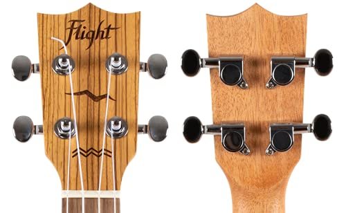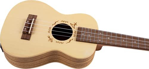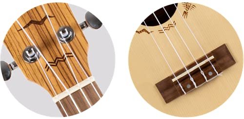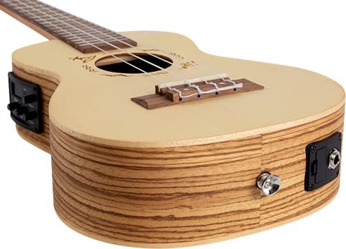 This uke has a solid European engelmann spruce top and laminate zebrawood sides that combine to deliver a sound that is sharp and punchy