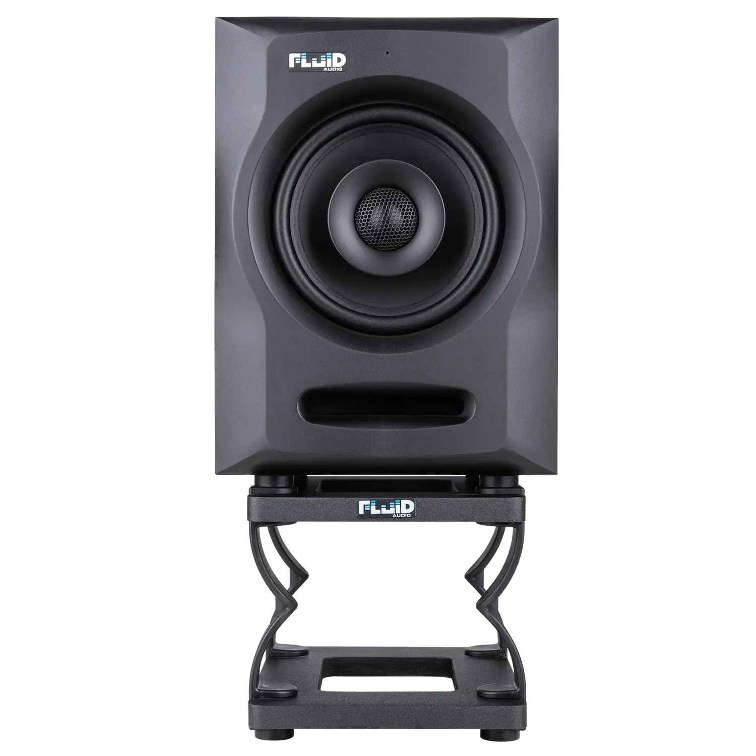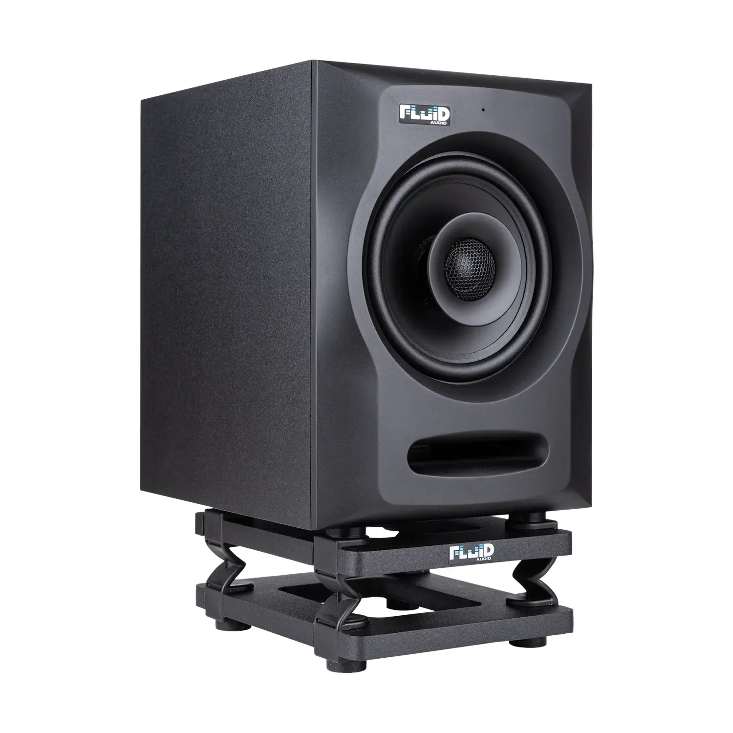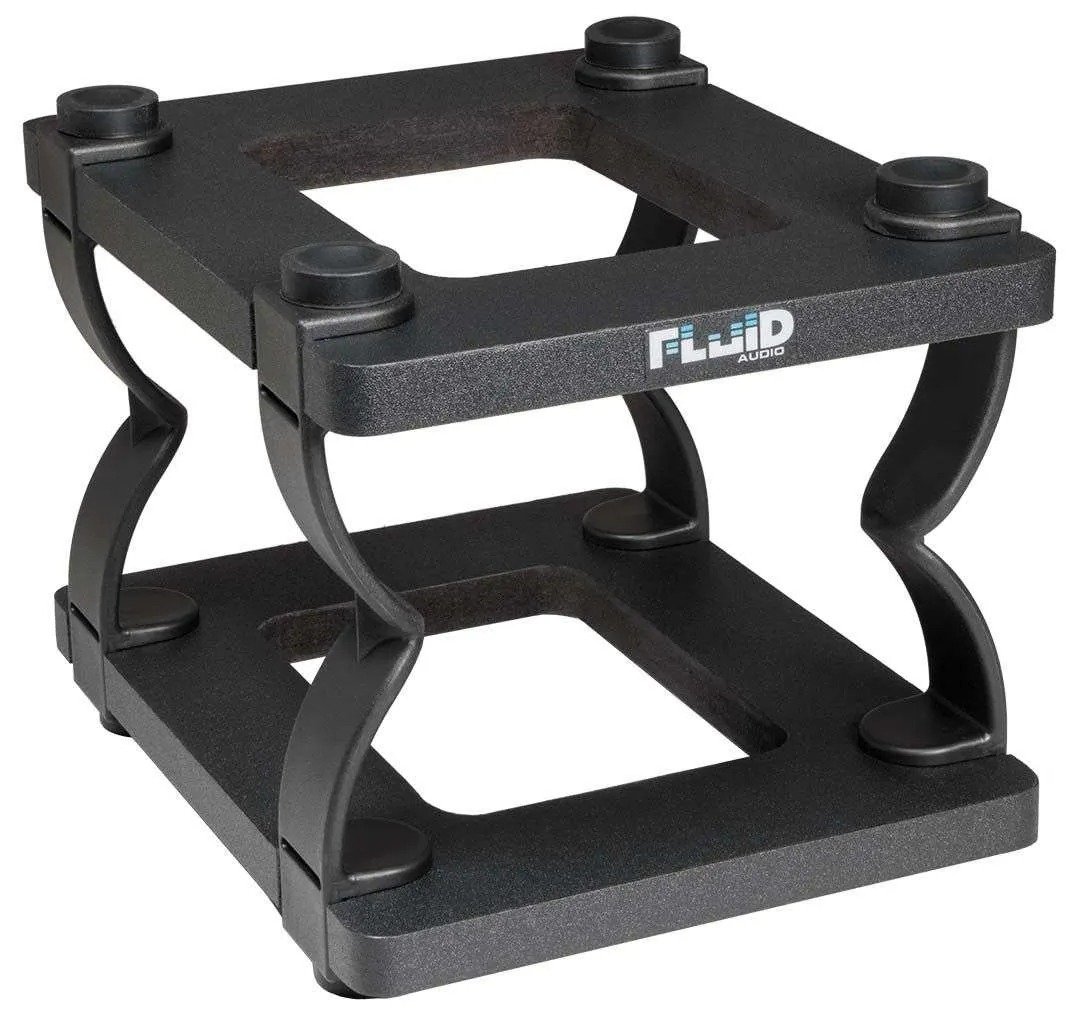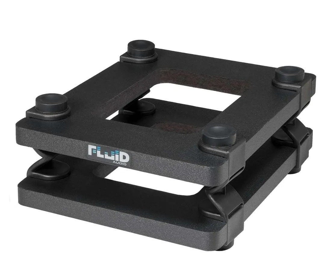 The Fluid Audio DS5 desktop monitor stand is designed for use with 4” and 6” studio monitors. They elevate your monitors to one of two heights: 2.5” and 5”. Using custom formulated rubberized silicone feet, the stands provide critical acoustic isolation. Tilt can also be set to one of 3 angles: Flat, 3, and/or 6 degrees of tilt.