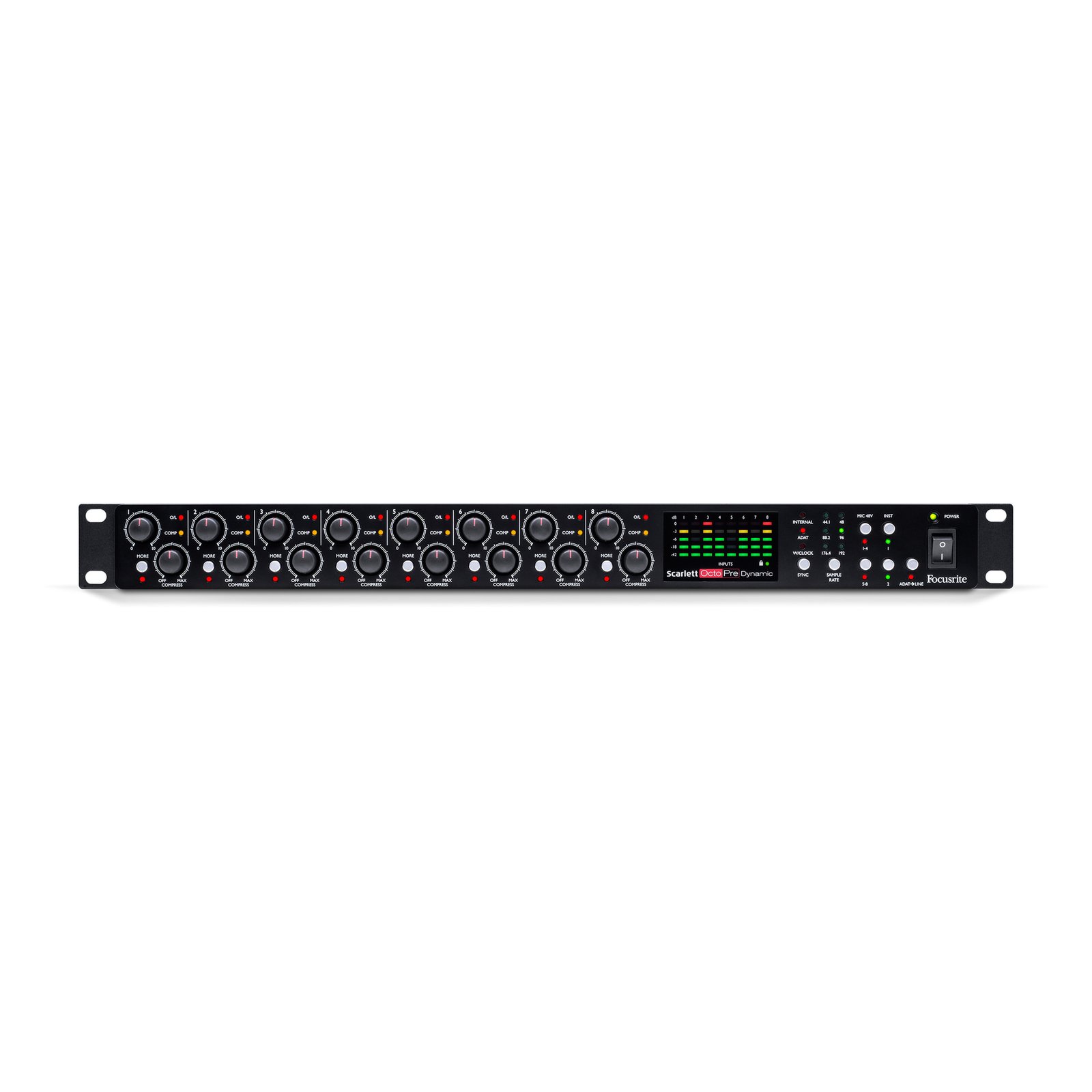 Building on the features of the Scarlett OctoPre, Scarlett OctoPre Dynamic brings you the ultimate Scarlett expansion with eight Scarlett mic preamps and analogue compression on every input channel providing a musical, soft-knee style of compression for more subtle control of your dynamics. The MORE button then allows you to double the ratio for more aggressive compression effects.