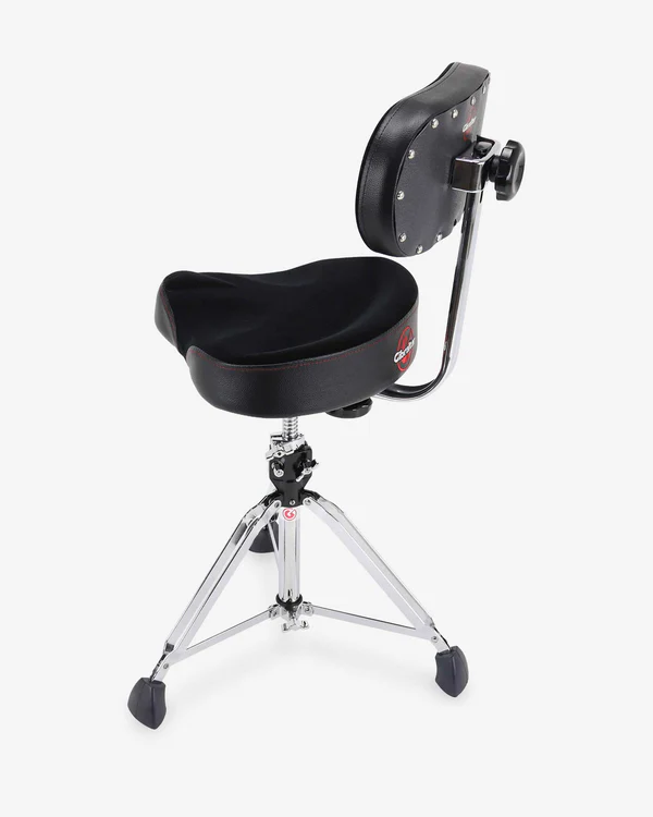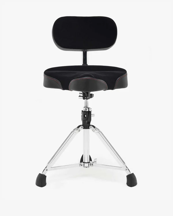 A heavy-duty saddle-style drum throne with a backrest, designed for ultimate comfort and support during long performances.