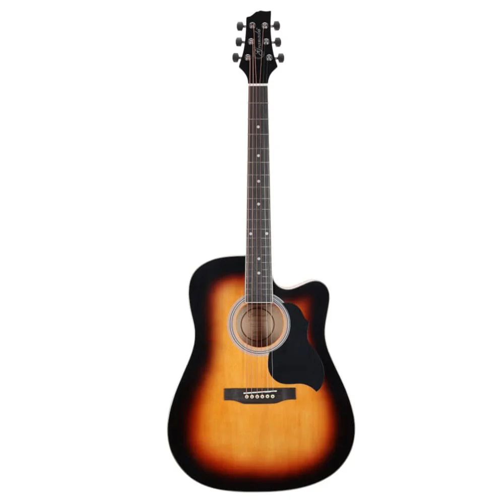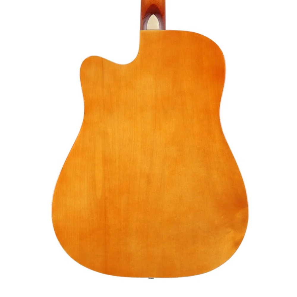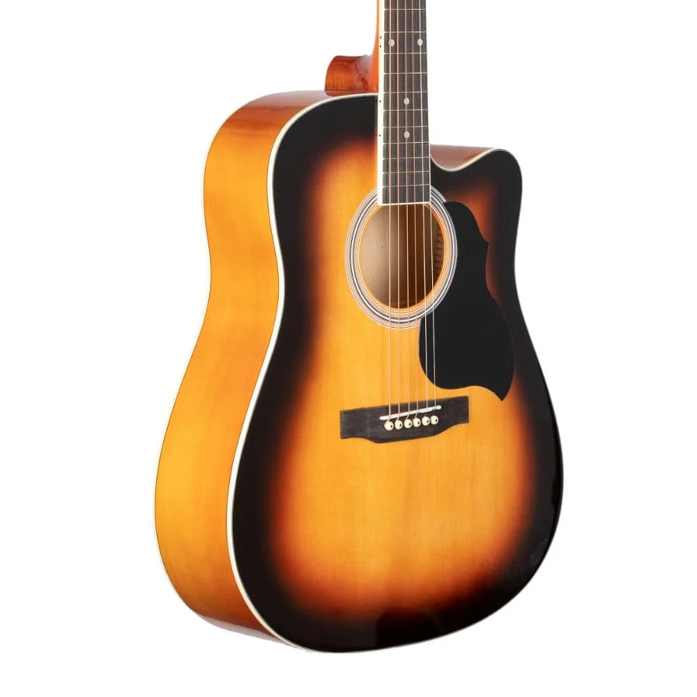 Features: Full-size 41″ Dreadnought guitar with a Cutaway Massive and punchy tonal projection Chrome diecast tuners All Linden Laminate construction Specifications: Body Shape: Dreadnought Cutaway Cutaway: Yes Top Material: Linden Laminated Back Wood: Linden Laminated Sides: Linden Laminated Length: 41″ Scale length: 650 mm Binding: ABS Rosette: Decal Logo: Laser Bridge: Composite Rosewood Tuners: Die Cast Chrome Fingerboard: Composite Rosewood Nut: ABS String: Local EQ: No Finish: Gloss Color: Vintage Sunburst Gloss