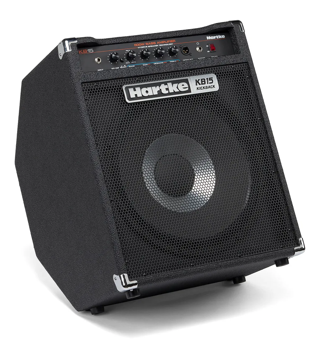 The Kickback KB15 features a 500-watt, high-efficiency Class D amplifier and a 15-inch Hydrive Series speaker with a neodymium magnet. Hartke Hydrive’s unique hybrid cone speaker is constructed with an outer paper cone that produces deep and warm low frequencies, and an inner aluminum cone that produces mids that are cutting yet sweet. The specially designed cabinet can be used flat on the floor or in a “kickback” position for increased high-end clarity and directionality. The amplifier design, along with neodymium speaker magnets, combine tremendous power with a lightweight design.