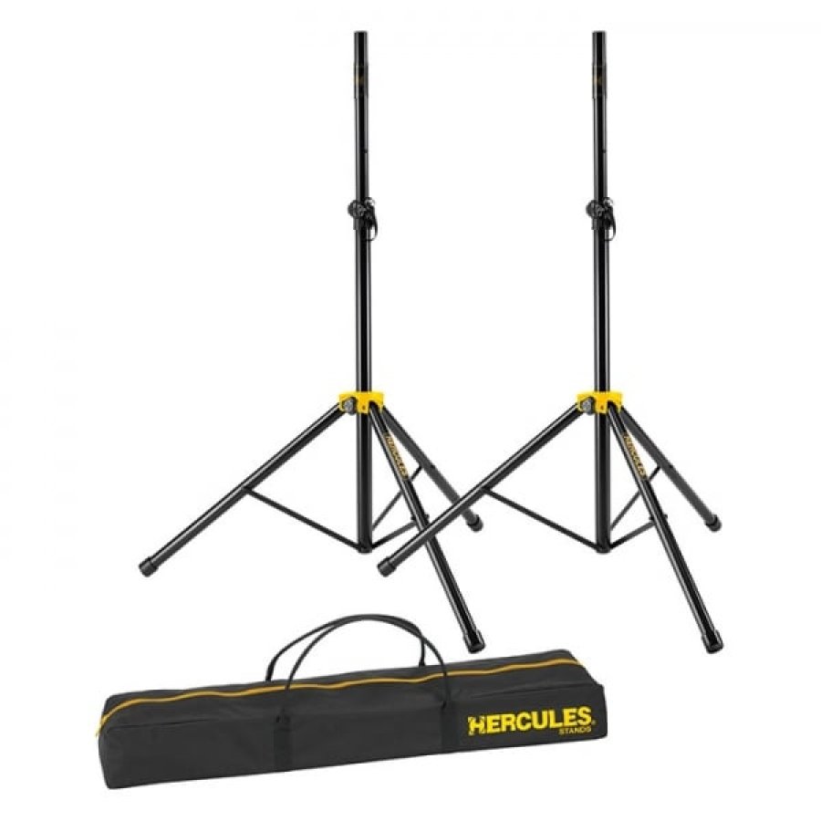 The HERCULES Stage Series Speaker Stand SS200BB Pack includes two Tripod Base Speakers Stands SS200BB and the carrying bag.