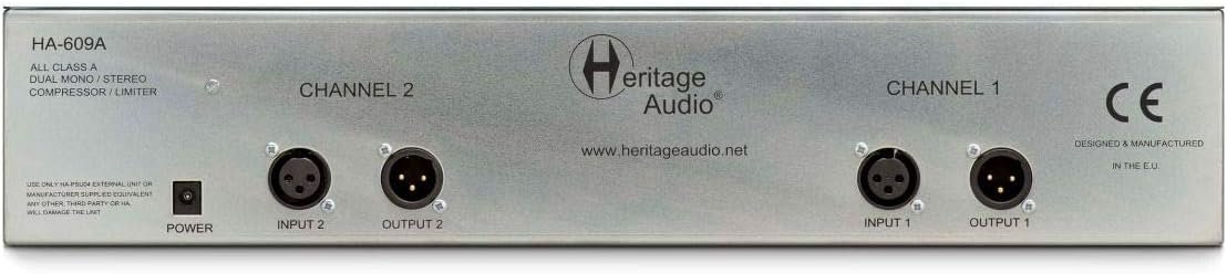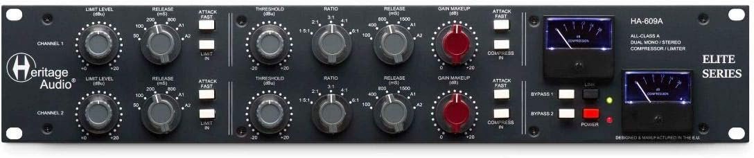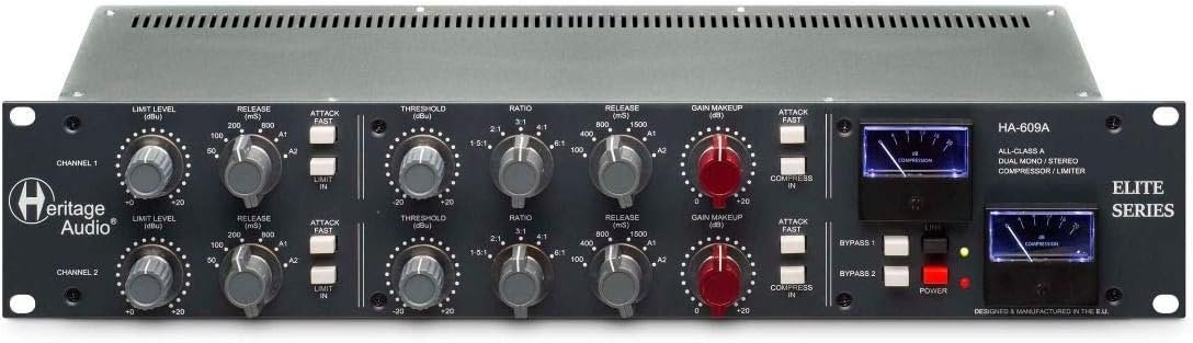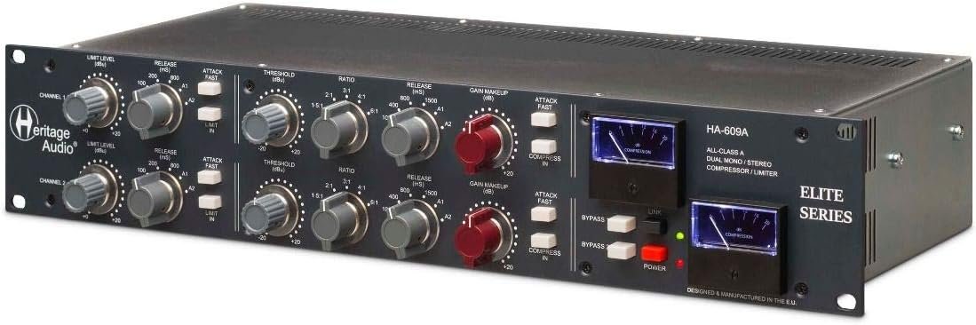 Fortify Your Sound With Holy Grail British Compression Based on legendary vintage British-spec diode bridge compressor/limiter designs, the Heritage Audio HA-609A fortifies your mixes, stems, and tracks with punch, weight, and color. This boutique 2-channel unit features a fully discrete Class A signal path with three Carnhill/St. Ives transformers per channel, in addition to a transformer-coupled ’73-style gain circuit for compressor makeup gain. For maximum sonic and operational flexibility, the HA-609A is equipped with special fast settings for both compression and limiting, along with stereo link and dual mono modes.Add warmth, girth, and authority to any sound source As with all Heritage Audio Elite series equipment, the HA-609A is handcrafted at Heritage headquarters in Spain using cutting-edge manufacturing methods and top-shelf components, including rotary switches and precision, stepped potentiometers for accurate recall and channel matching. The Heritage Audio HA-609A is ready to add warmth, girth, and authority to any sound