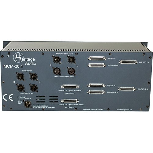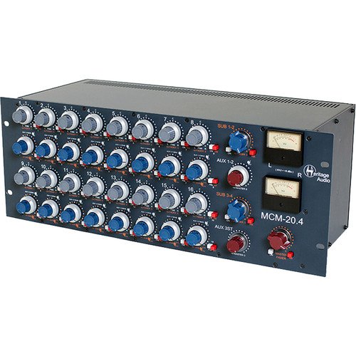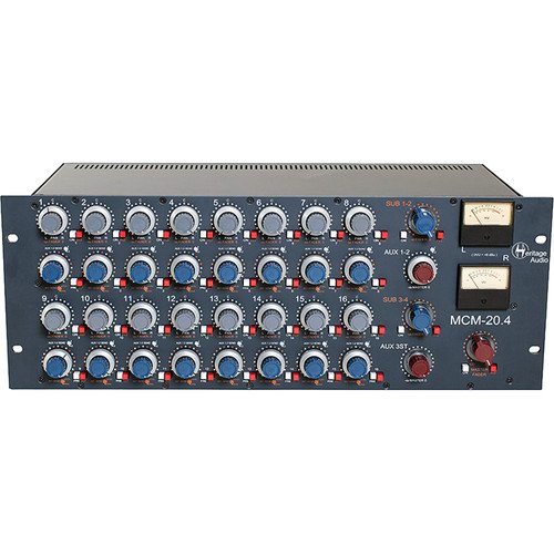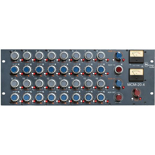The Heritage Audio MCM-20.4 is a rackmount analog summing mixer that delivers vintage-quality sonics along with sophisticated routing options to streamline your hybrid studio setup. The MCM-20.4 offers 16 input channels arranged into two subgroups of eight. Each channel features concentric pan and level controls plus a balanced insert and a mute switch. Each group has its own stereo fader and balanced insert point. Both stereo subgroups are passively summed into the master bus, which has its own balanced insert point and VU meters. Makeup gain is provided by a transformer-coupled, 1073-style Class A mic preamplifier with four transformers (two per channel). Four channels of pre/post-fader aux sends are provided: AUX 1 and 2 are mono; AUX 3 is stereo. Insert send points are always signal-present, giving them an alternative use as direct outputs for recording. Rear-panel connections are made via DB-25 connectors; except for the master bus, which has dedicated XLRs.