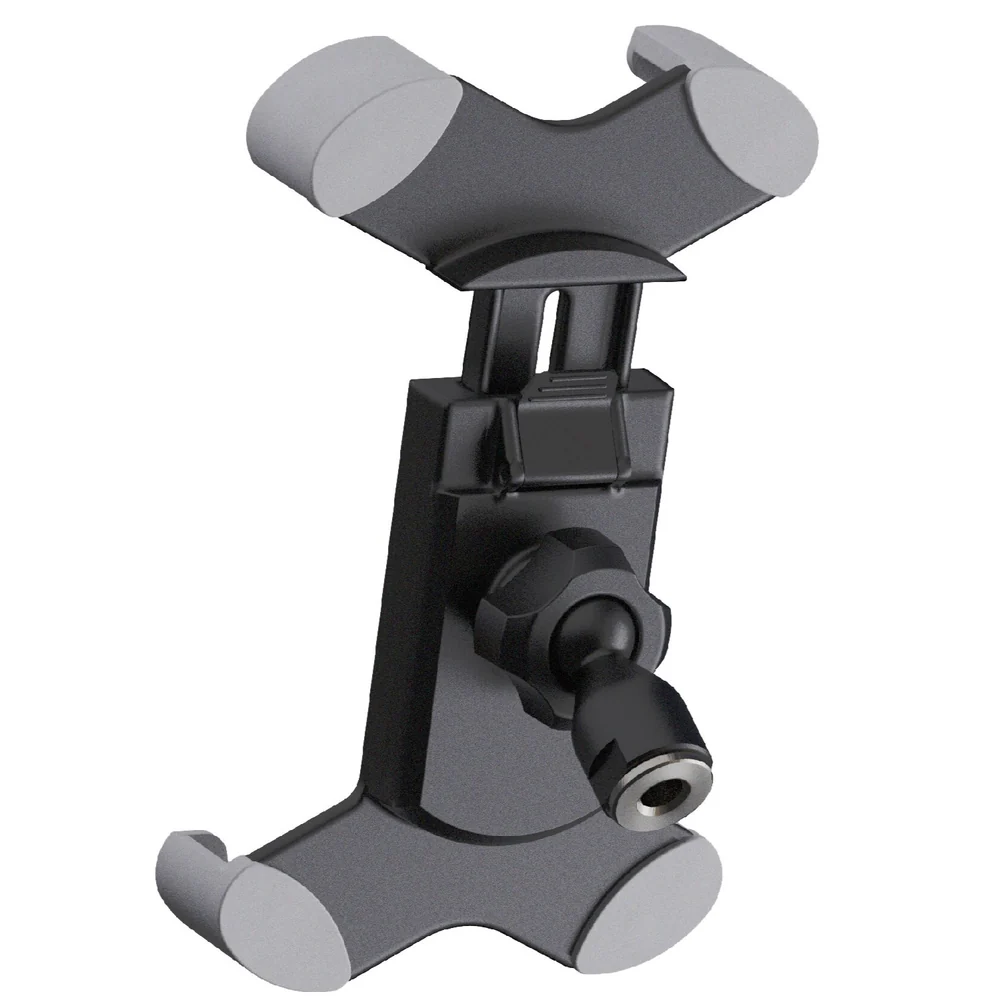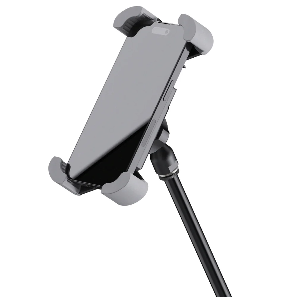 Thanks to the flexible ball joint, the holder can be tilted up and down and rotated 360°. The 3/8″ or 5/8″ thread allows the smartphone holder to be screwed onto any microphone stand, table stand or microphone arm.