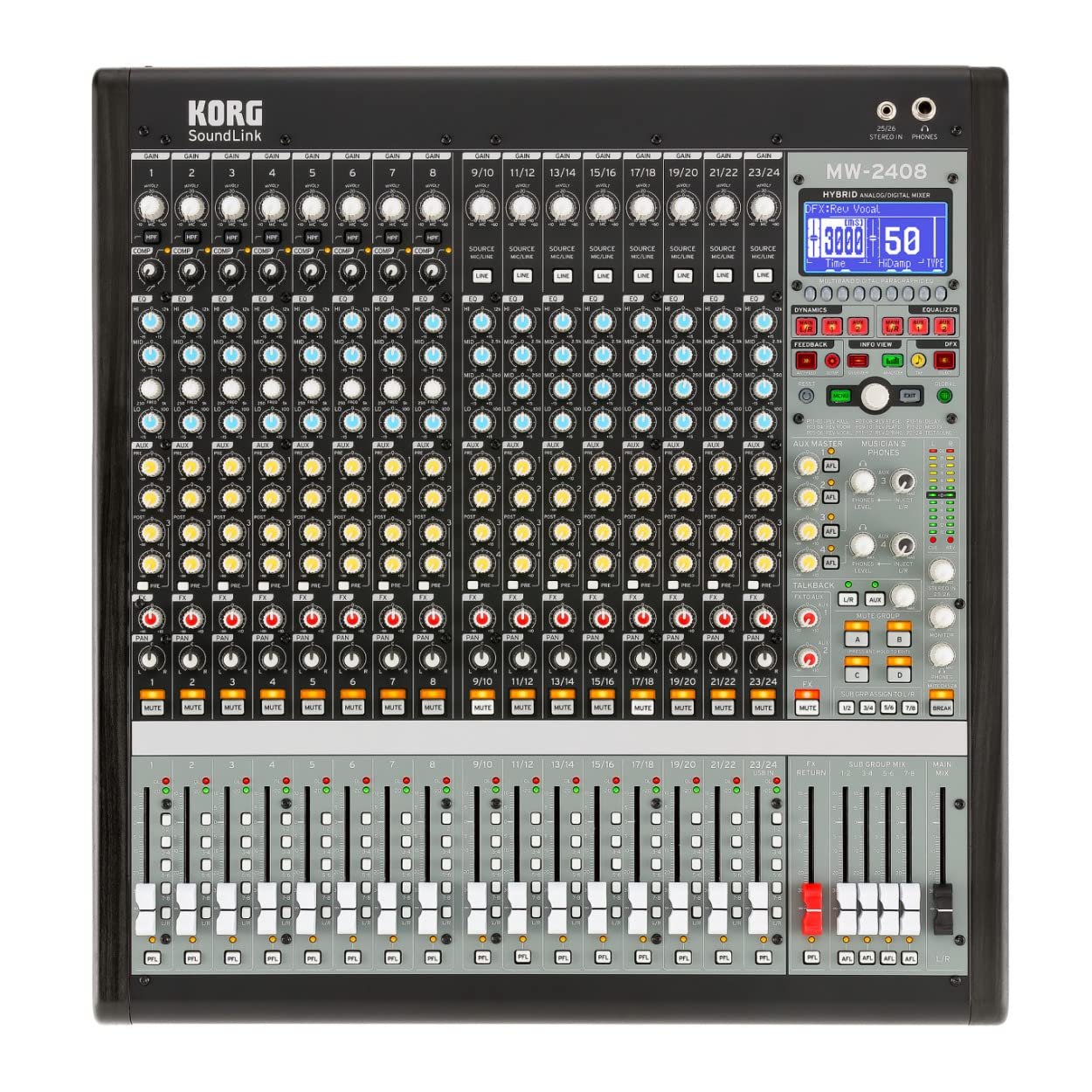 For audio professionals and enthusiasts seeking unparalleled control over their sound, the KORG Soundlink MW2408 24-Channel 8-Bus Hybrid Analog/Digital Audio Mixer is the definitive solution. Whether you’re managing live performances, studio recordings, or broadcast productions, this mixer delivers the versatility and precision needed to elevate your audio experience. Its hybrid design combines the warmth and familiarity of analog mixing with the flexibility and power of digital control, offering you the best of both worlds in one robust package.