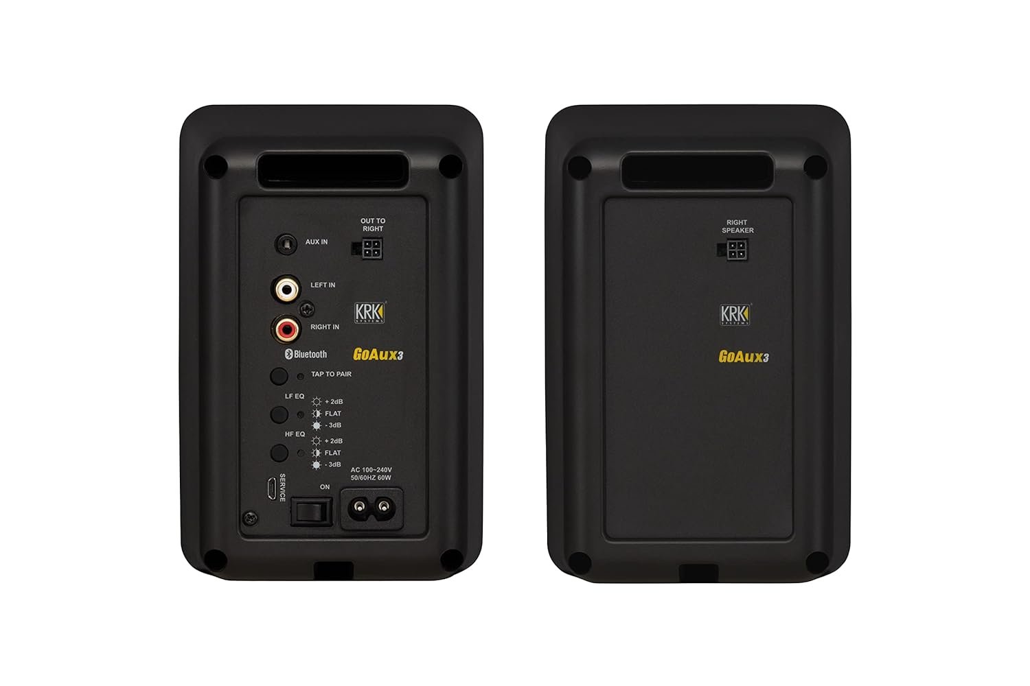 The KRK GoAux 3 portable nearfield monitors are designed to provide great sound anywhere you go. The GoAux 3 monitors come with a convenient nylon carrying bag that holds both monitors as well as the included monitor stands and any extra cables you want to take along with you. The stands are adjustable for the optimum monitoring positioning and angle. The GoAux 3 monitors pair a 3” glass aramid woofer with a 1” soft textile dome tweeter in a 60 W RMS (total system power) bi-amplified two-way design. The rear-ported ABS cabinets are durable and supply surprising bass extension for a portable speaker. With the power amps located in one speaker’s housing and the second speaker powered through an included speaker-level connection from the first, the pair only needs a single AC outlet for operation. Built-in LF and HF EQ let you adjust the monitors’ response to the room and your personal preferences. Along with the 1/8” Aux and RCA stereo inputs, Bluetooth capability means you can connect wirelessly to your smartphone, computer, or other Bluetooth-capable audio devices. When you need to monitor silently, you can connect to the front panel 1/8” stereo headphone output, which automatically mutes the GoAux 3 speakers.