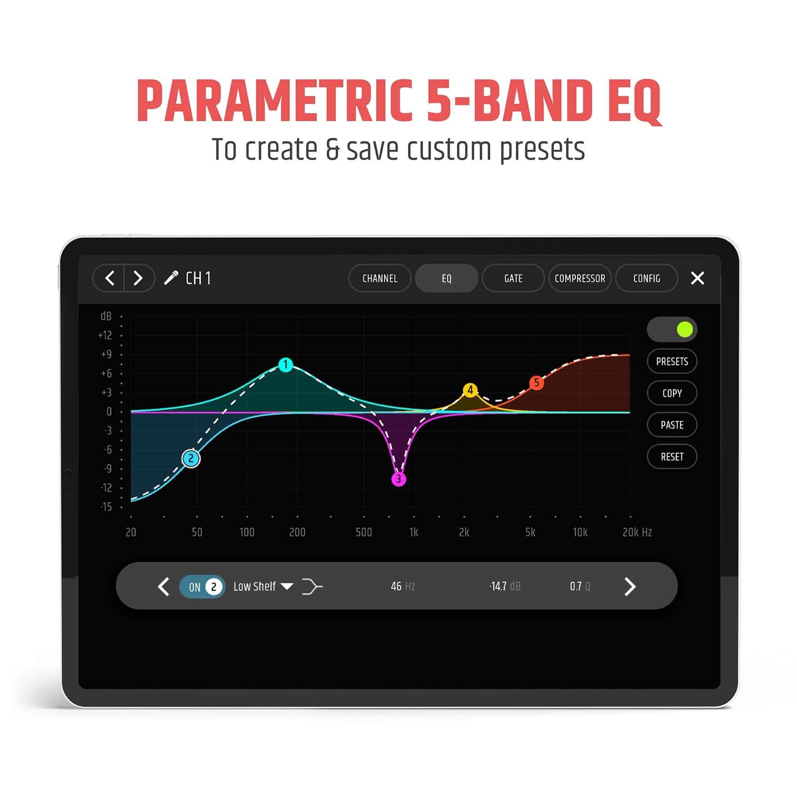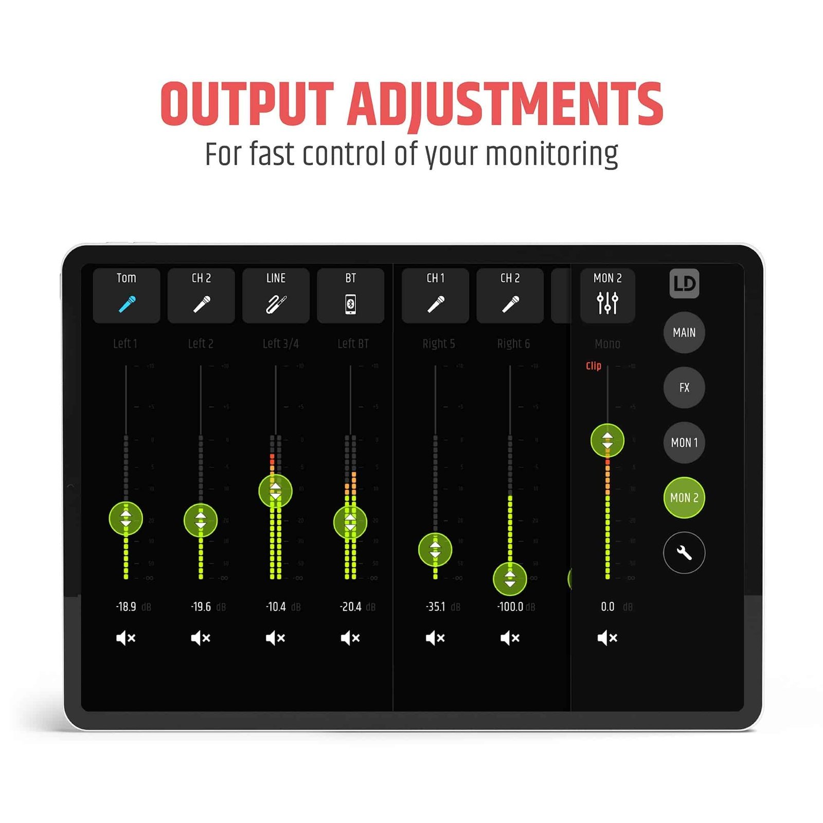 Controls : Bluetooth HOLD TO LINK button, Cardioid On/Off, Main level, Power On/Off, Sub level
