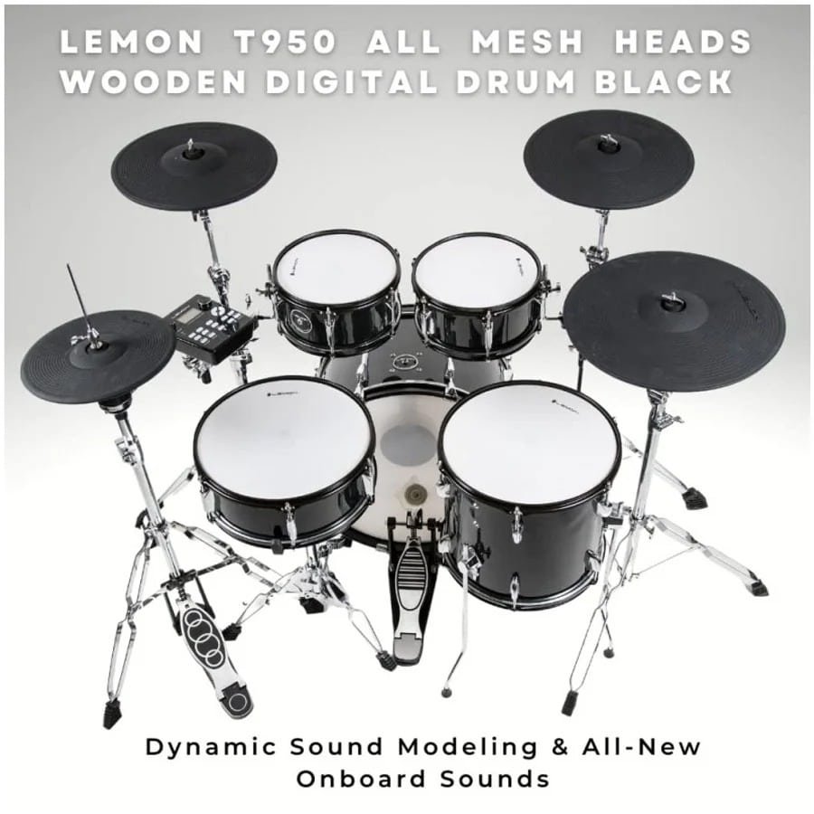 The Lemon Drums T-950 is designed for drummers who want an electronic kit that looks and feels like a real acoustic set. With full-sized wooden shells and mesh heads on all drums, it replicates the natural bounce and tactile feedback of traditional drums. The included acoustic-style hi-hat stand adds an extra level of realism, offering smooth pedal action and authentic motion. Whether you’re practicing, recording, or performing live, the T950 bridges the gap between modern electronic versatility and classic acoustic drumming experience — giving you the best of both worlds in one sleek, performance-ready kit.